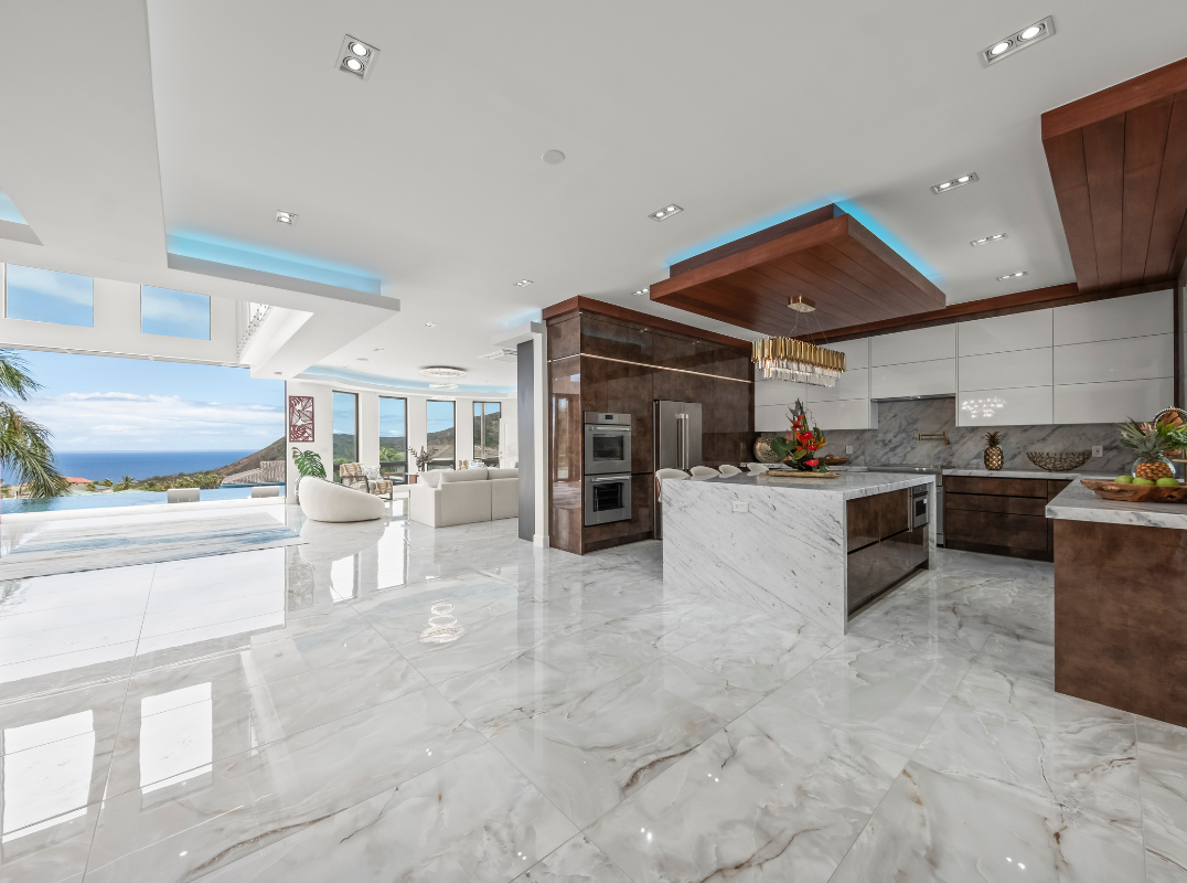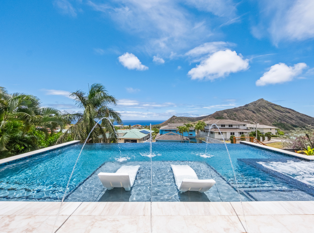 Luxury living in this stunning newly custom-built estate in Na Pali Haweo. Constructed with steel frames, beams, and columns, this home offers breathtaking panoramic views of the ocean, Koko Crater, and vibrant sunsets. The expansive open floor plan showcases soaring ceilings and designer appliances. LED lights are embedded in the walls and in the custom European kitchen cabinets that have drawers with soft touches. An infinity, self-cleaning saltwater pool and spa feature a sophisticated glass tile finish. Each bedroom has ensuite bath, primary has golden bathtub, and one room is flooded with natural light from seamless corner windows. 123 Waihili embodies modern island living, where you can experience tranquility and relaxation with this serene, indooroutdoor lifestyle.