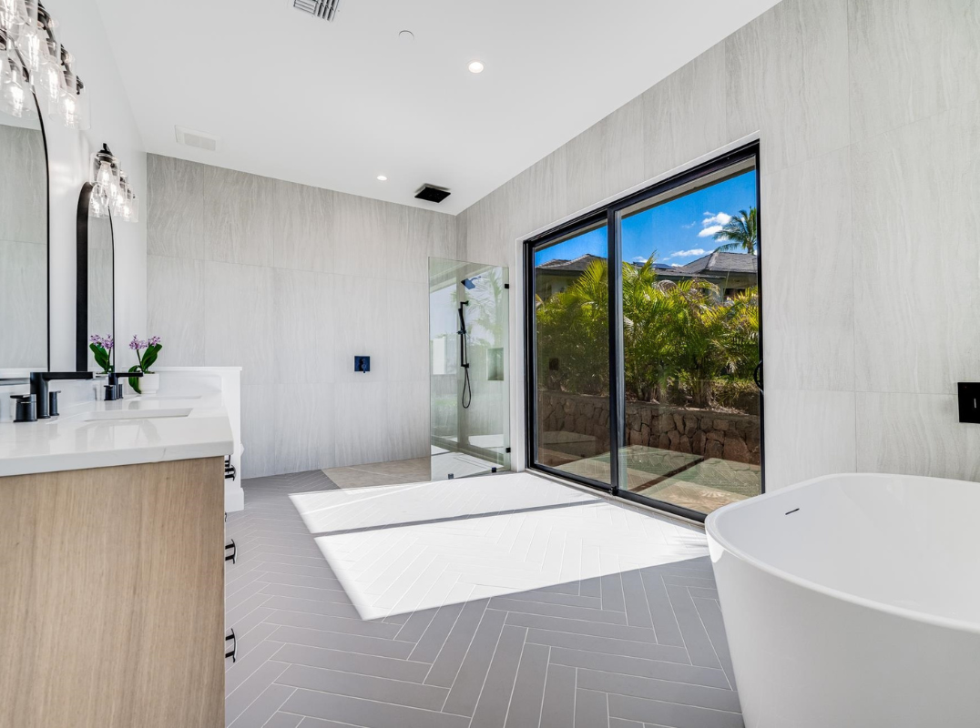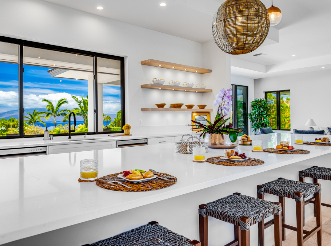 Elevated design meets serene island living in this architectural triumph within the esteemed double-gated Lanikeha community in the Ka'anapali Golf Estates. This 4-bedroom, 5-bathroom residence spans 3,710 square feet of interior space, offering a harmonious blend of contemporary luxury and timeless Hawaiian elegance. From the moment you enter, you'll be captivated by the expansive, light-filled layout. High ceilings and wide-plank white oak flooring create a seamless flow throughout the home. The gourmet kitchen boasts a Miele refrigerator, a Wolf range, dual dishwashers, and a thoughtfully designed pass-through window connecting to the outdoor kitchen and BBQ—a feature crafted for effortless entertaining. Nearly 1,000 square feet of covered lanai beckons you to savor meals and tranquil moments while soaking in panoramic ocean and outer-island views. Just beyond, the stunning in-ground pool boasts a Baja shelf and an oversized hot tub—a true retreat designed for relaxation and indulgence. Practicality meets luxury with features such as a three-car garage, two-zone central air conditioning, and Hana Hou Builders' signature attention to detail. Each element of the home has been meticulously curated to enhance your elegant living experience, including the landscaped grounds that complement the home's modern aesthetic. You are within 5 minutes of Kaanapali Beach and Whalers Village shops. You are also a stone's throw away from the Ka'anapali Golf Courses, while the PGA Plantation Course in Kapalua is just a 15-minute drive. Lanikeha owners also enjoy access to a fabulous community clubhouse with a fitness center, billiards, and a beautiful infinity-edge pool. This move-in ready, new luxury residence exemplifies elegant contemporary island design. Its flawless design, functionality, and perfect location make it an extraordinary opportunity to open the door to the ultimate Ka'anapali resort-style living.