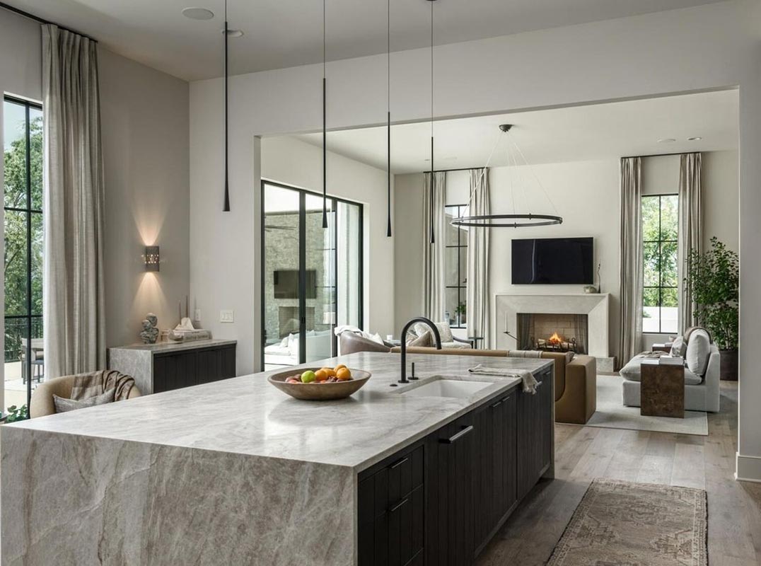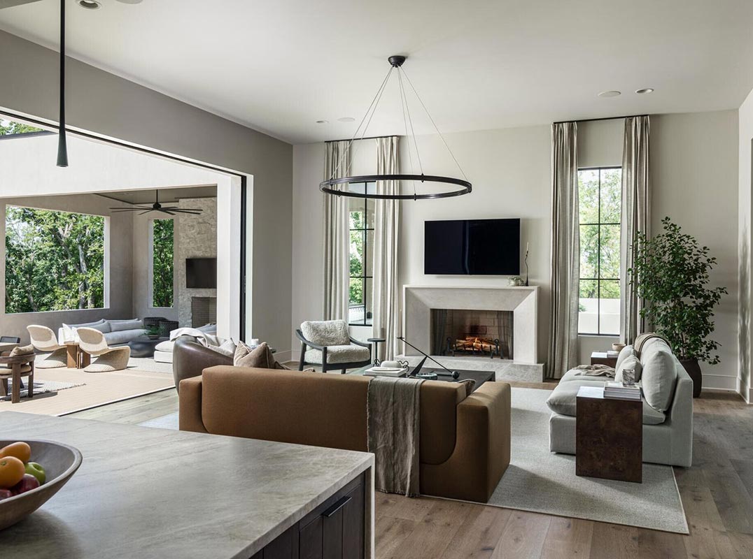 A grand two-story foyer filled with natural light opens to soaring 12’ ceilings and a dramatic great room anchored by a sculptural fireplace and sweeping views. Perfect for sophisticated entertaining, the home features a formal dining room, bespoke bar lounge, scullery, and designer kitchen centered around a striking Taj Mahal quartzite island with custom cabinetry. Every surface, from ArcusStone detailing to designer lighting, was selected to elevate form and function.