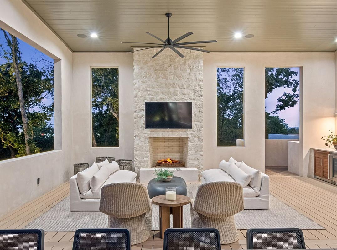 Step outside to a resort-style oasis with covered/open terraces, a saltwater gunite pool with turf surround, alfresco kitchen, fireplace, and built-in whole-home speakers.