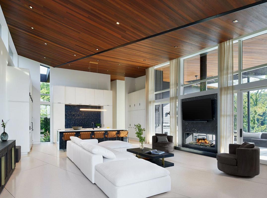A rare fusion of world-class design and natural beauty, this gated modern estate with 4 bedrooms (1 in basement) by esteemed firm EOA, featured in Architectural Digest, is a true masterwork on 26 acres, just 5 minutes from the interstate and 15 minutes from the airport. Designed as the builder’s personal residence, every detail reflects permanence, performance, and elegance. Behind a private gate and long paver-lined drive, the home opens to a luminous living space with soaring ceilings, terrazzo marble floors, and walls of glass framing serene views. Accents of Brazilian Ipe wood provide warmth and texture, balancing bold architecture with inviting comfort.