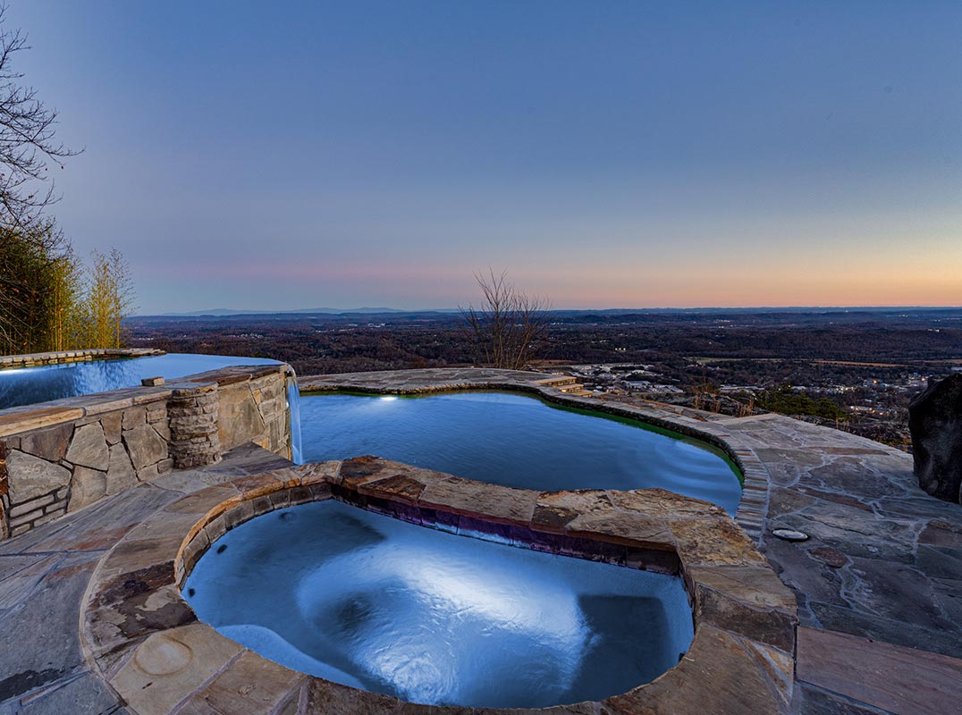 Enjoy 270° panoramic views, two resort-style pools including a dramatic infinity pool cascading into a second, a hot tub overlooking the valley, and four wood-burning fireplaces throughout the property.