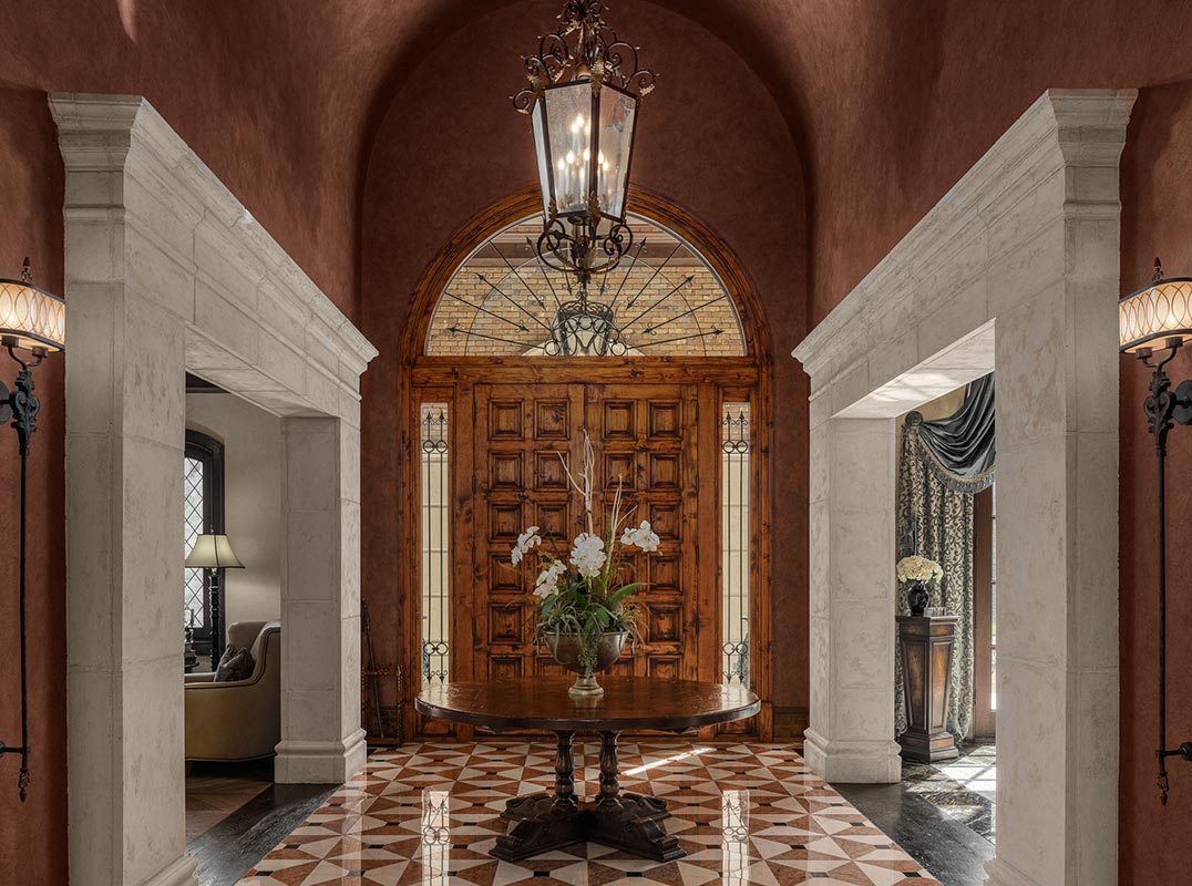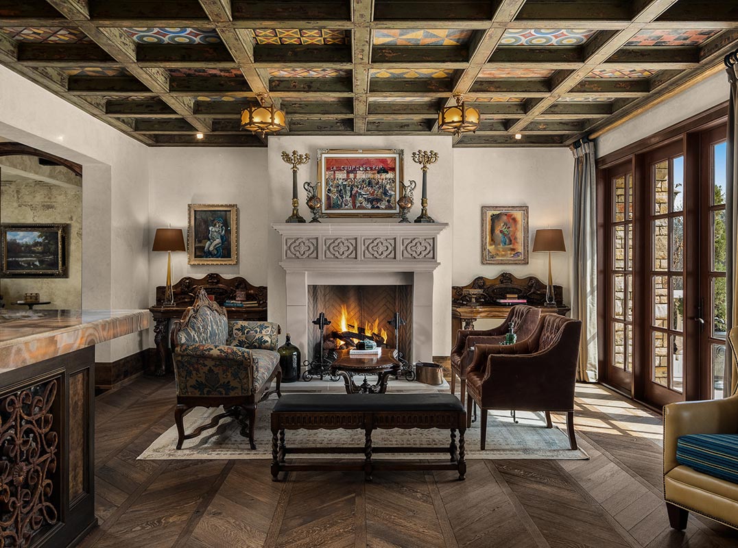 Outside, resort-style grounds transport you to the Italian countryside with a saltwater pool and spa, fully equipped outdoor kitchen with wood-fired pizza oven, and a fire pit framed by a replica “ruins wall” inspired by ancient Italy. Designed for privacy and security, the estate sits on 2.5 acres and includes an elevator, hidden safe room/storm shelter, large kitchen loggia, multiple balconies, a seven-car garage, and advanced Control4 smart home technology.