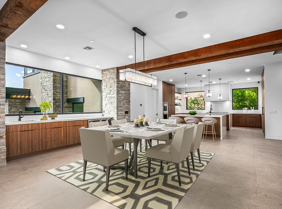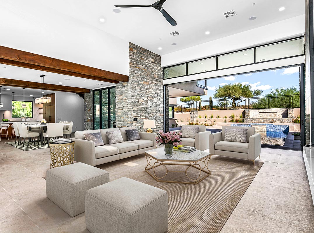 The heart of the home is a chef’s kitchen anchored by two expansive islands—ideal for both intimate gatherings and large-scale entertaining. The dining room flows seamlessly into the great room, where walls of glass fold open to a sweeping covered patio. Here, indoor and outdoor living become one, enhanced by a resort-inspired pool whose unique design feels as though it extends into the home itself.