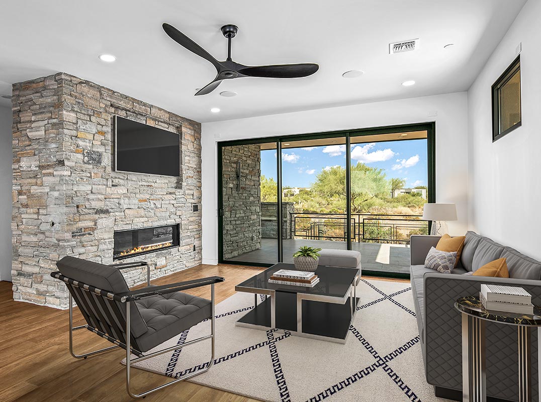 Upstairs, a floating staircase leads to a guest and entertainment retreat where panoramic views capture the very essence of desert beauty—rolling fairways, the rugged McDowells, Brown’s Butte, and unforgettable sunsets that melt into city lights.
