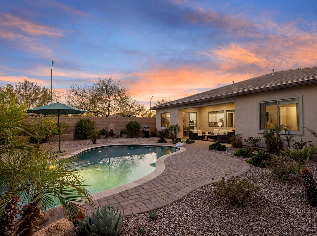 Beautifully upgraded home, perfectly positioned on a quiet cul-de-sac lot. Designed for modern comfort and entertaining, this residence offers a seamless blend of elegance, functionality, and Arizona outdoor living. Enjoy your resort-style backyard oasis complete with a sparkling pool and covered outdoor living space, surrounded by lush, landscaping perfect for relaxing or entertaining.