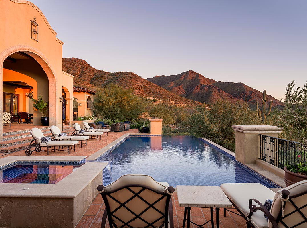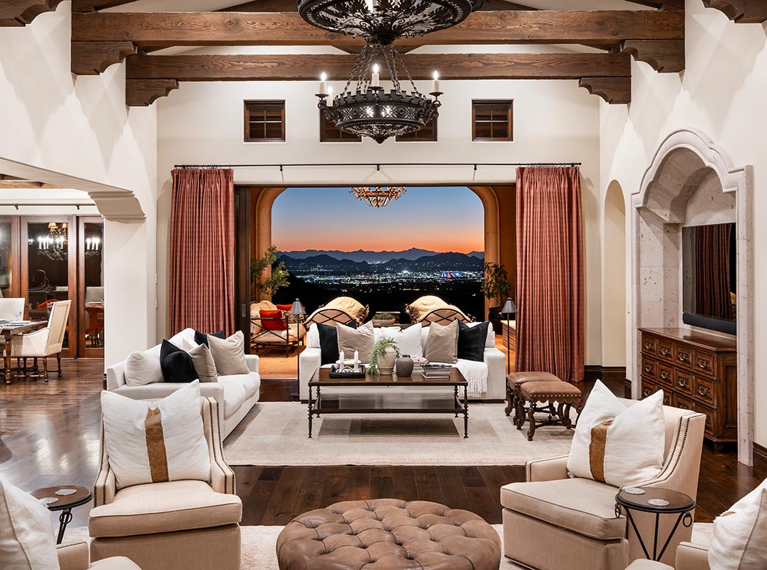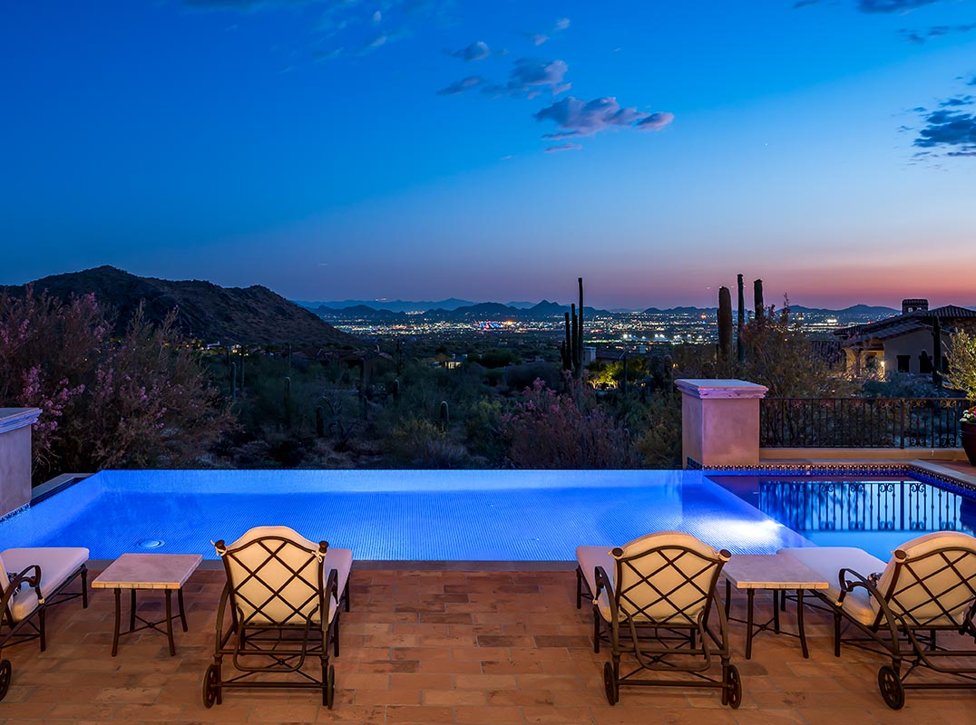 Perched in the coveted Upper Canyon of Silverleaf, this architectural masterpiece captures the essence of Scottsdale luxury living—where the indoors and outdoors blend seamlessly against a backdrop of endless mountain silhouettes and sparkling city-light vistas. Situated on a premium corner homesite with a postcard worthy mountain backdrop, arrive through the gated auto court to the home's entry courtyard with its tranquil water feature which sets an unmistakable tone of serenity and sophistication. Inside, the great room serves as the heart of the home, drawing the eye outward through disappearing glass walls to a breathtaking panorama of the valley below. The indoor-outdoor living experience defines this residence. A generous covered patio spans the entire rear of the homecomplete with built-in heaters, a fireplace, and multiple lounge and dining areasall oriented toward a negative-edge pool that appears to cascade into the cityscape. Whether entertaining under the stars or unwinding beside the fire pit with mountain silhouettes beyond, every moment feels cinematic. The luxurious kitchen is both warm and refined, featuring weathered-leather granite, double islands, two-tone custom cabinetry, and top-tier Wolf appliances, including a six-burner gas cooktop with griddle, opening to the outdoor covered dining terrace and outdoor kitchen. Wood-beam ceilings and artisan tile accents add texture and depth throughout. The open dining room connects beautifully to the courtyard, framed by a brick cross vault ceiling that gives a nod to timeless craftsmanship. The primary suite is a sanctuary of privacy and light, opening directly to the patio for peaceful mornings and glowing sunset views. Secondary ensuite bedrooms are thoughtfully split, offering space and comfort for family or guests. A handsome executive office with built-ins provides an ideal retreat for productivity or quiet reflection. A private elevator and patio stairs both lead to the guest residence, where guests enjoy their own living area, kitchenette, two ensuite bedrooms and a view balcony overlooking both the mountains and the city belowa true extension of the home's effortless hospitality.