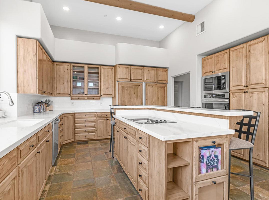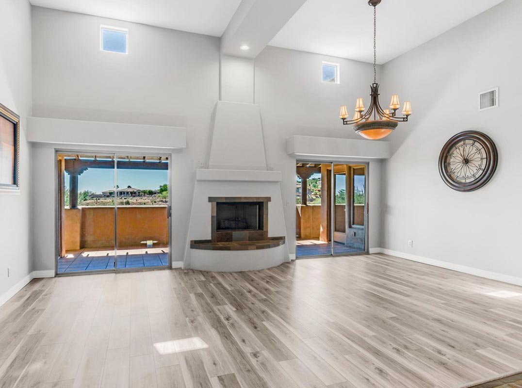 Awesome Home in Westridge Estates for Sale! This Southwestern style home will stun you with all the desert charm, starting with beautiful curb appeal, fresh exterior paint, and a private courtyard entry. The freshly painted interior starts off soaring ceilings that are airy and bright, with formal living and dining, complimented with desert and mountain views, soaring ceilings, new flooring, and access to a wrap-around balcony to enjoy said views. The kitchen is spacious and an entertainer's delight, featuring Sub Zero refrigerator and freezer, stainless appliances, new quartz countertops and an expansive island with breakfast bar seating, and the exposed beams add to the charm! The Primary Bedroom is spacious with two-way fireplace and access to the balcony, along with a gorgeous ensuite that has a walk-in shower, soaking tub, large closets. The first level also features a theater room, perfect for movies with friends and family, plus one of the spacious secondary suites.