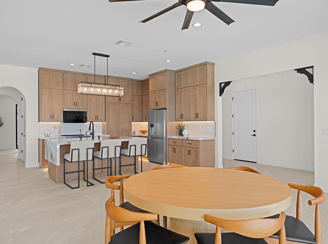 Stunning brand-new Kelco Home showcasing exceptional craftsmanship, beautiful views, and extreme privacy. This 4-bedroom modern Hacienda-inspired residence offers massive square footage and an entertainer's dream layout. Thoughtfully designed with warm, inviting finishes, architectural archways, and a seamless indoor/outdoor flow. Enjoy a huge living, kitchen, and dining area perfect for gatherings, plus an additional bonus room ideal as an office, second living space, or flex hangout. The spacious owner's suite features a luxurious double walk-in shower, soaking tub, creating a beautifully finished bathroom retreat. Step outside to your massive pool and spa, designed for relaxation and entertainment. Finished with marble pavers, water features, and a fire feature. For all your toys, this property includes an impressive 25x64 ft RV garage offering exceptional storage and functionality. A rare combination of privacy, custom design, and true Kelco quality-this 4-bedroom home is an absolute must see.