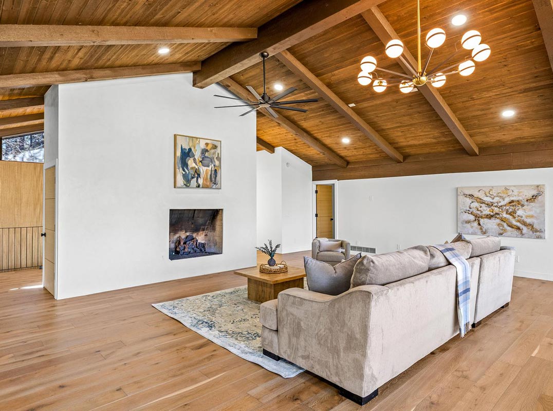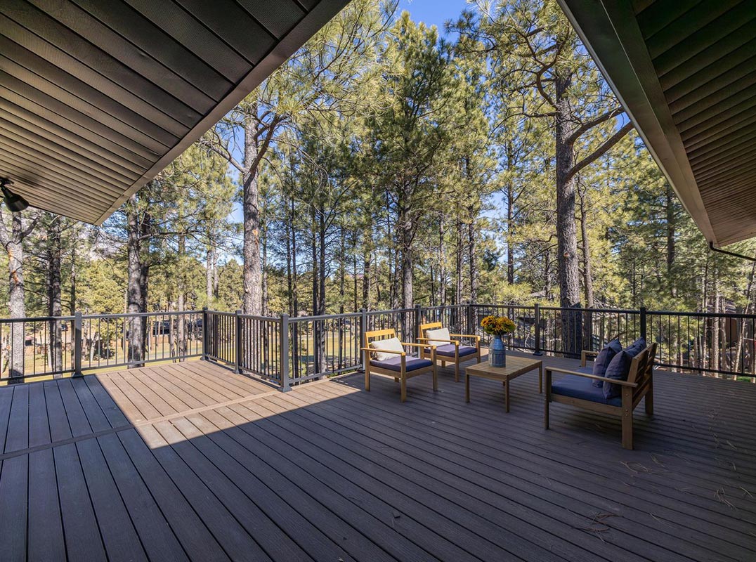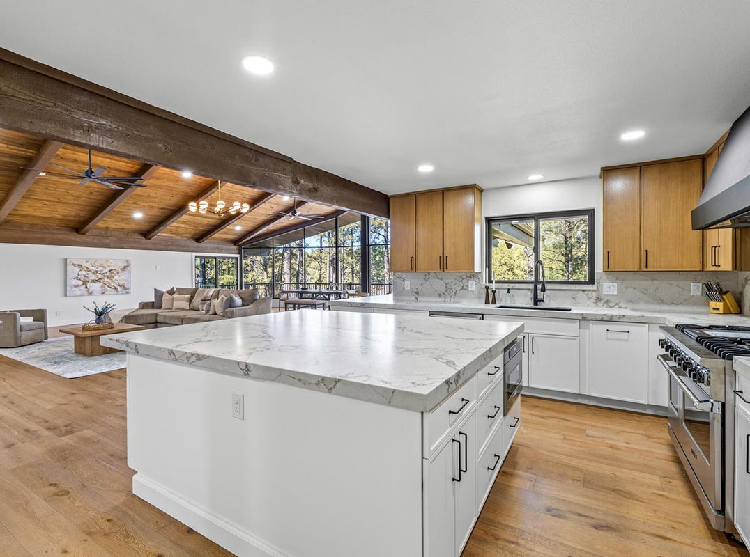 Set along the 10th fairway of the Continental Country Club and capturing sweeping views of Mount Elden, this legacy residence is part of the original architectural fabric that shaped the Continental community. Fully reborn through an elevated 2025 luxury renovation, the home blends timeless pedigree with sophisticated modern design. A new roof installed in 2023 anchors the major structural improvements. The 2025 transformation delivers all-new electrical, refined T&G ceilings, solid white oak slab doors, and expansive wide-plank flooring that bring warmth and contemporary elegance throughout the home. The great room is centered around a sculptural limestone fireplace, creating a dramatic, architectural focal point framed by golf-course and mountain views. The chef's kitchen features Viking appliances, custom cabinetry, designer lighting, and a fully appointed butler's pantry crafted for elevated cooking and entertaining. Offering 4 bedrooms and 3.5 bathrooms, the layout includes a main-level primary suite with its own private fireplace, along with a lower-level ensuite retreat ideal for guests or multigenerational living. Outdoor living is exceptional: an expansive two-story Trex deck provides multiple vantage points overlooking the fairway and pine canopy, while new exterior siding completes the home's modern-mountain aesthetic with a crisp, cohesive finish. Located just a short walk from Continental amenities yet outside of any HOA, the property offers rare flexibility alongside premier golf-course living. An additional 900 sq ft grey-shell space awaits customization perfect for a future gym, theater, wine cellar, office, or creative studio. For the buyer seeking elite craftsmanship, modern luxury, golf-course frontage, and a piece of Continental's original history, this residence stands as one of Flagstaff's true showcase homes.