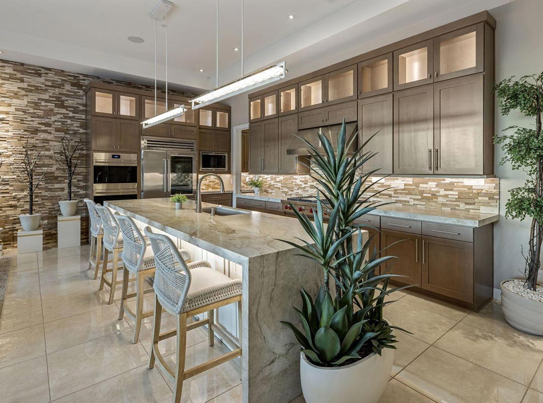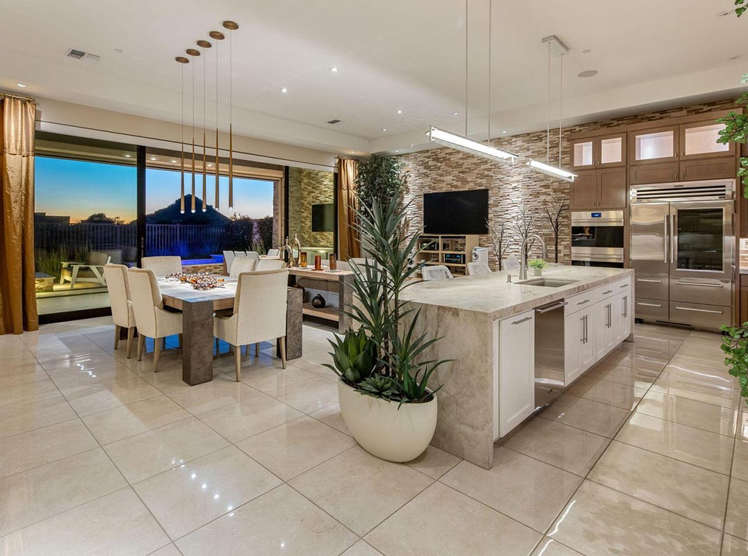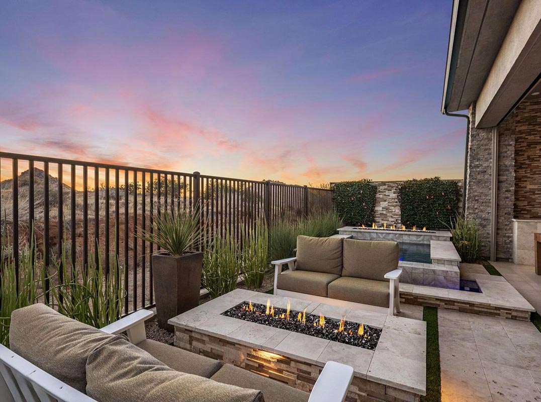 The great room's sliding glass doors frame the mountain views and extend the living space onto a covered patio and backyard area. Dramatic Natural Light throughout, enhanced by 10 x 20' retractable sliding glass doors opening to a tranquil outdoor covered patio, 2 fire pits, and a negative-edge spa. Sophisticated Low-Voltage Interior Lighting throughout, where the thoughtful beam spread width and aim of every bulb has produced an unparalleled ambiance, which is best seen in the evening. Gourmet Chef's Kitchen featuring professional-grade Wolf appliances, expansive center island, custom lighting, and stacked cabinetry, and generous prep space. Luxurious Primary Suite with expansive walk-in Classy Closet and spa-inspired bathroom featuring floating and underlit cabinets, back-lit mirrors, hand-made extraordinary wallpapers, glass-enclosed shower, Lutron electric shades, and large soaking tub. Designer Den/Office finished with stone wainscot, suede wallpaper, large glass rolling door, sound-reducing amenities, and amazing designer lighting. Incredible Customized Upgrades and Additions throughout the entire residence.