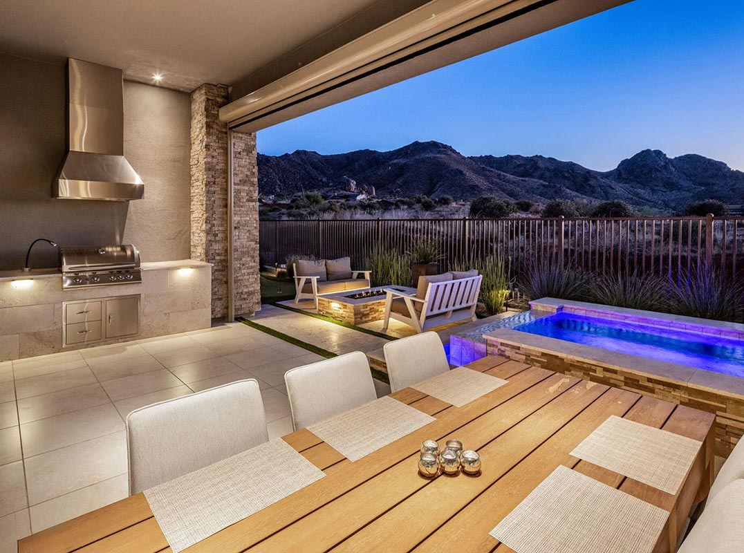 Discover modern resort-style living in this highly upgraded Enclave residence, situated on a premium lot backing to natural open space and offering dramatic McDowell Mountain views. Furnishings available to be purchased by separate bill of sale. Enhanced with over $340,000 of after-market upgrades, this popular Caullins floor plan offers an open concept design. The heart of the home is the gourmet chef's kitchen, appointed with professional-grade Wolf/Subzero appliance package, stacked cabinetry, custom lighting, and a large center waterfall island that doubles as both a workspace and gathering point.