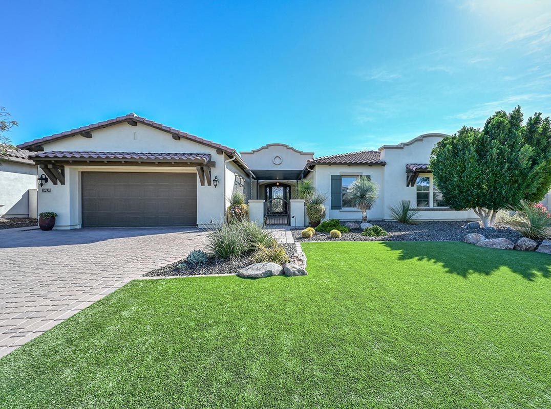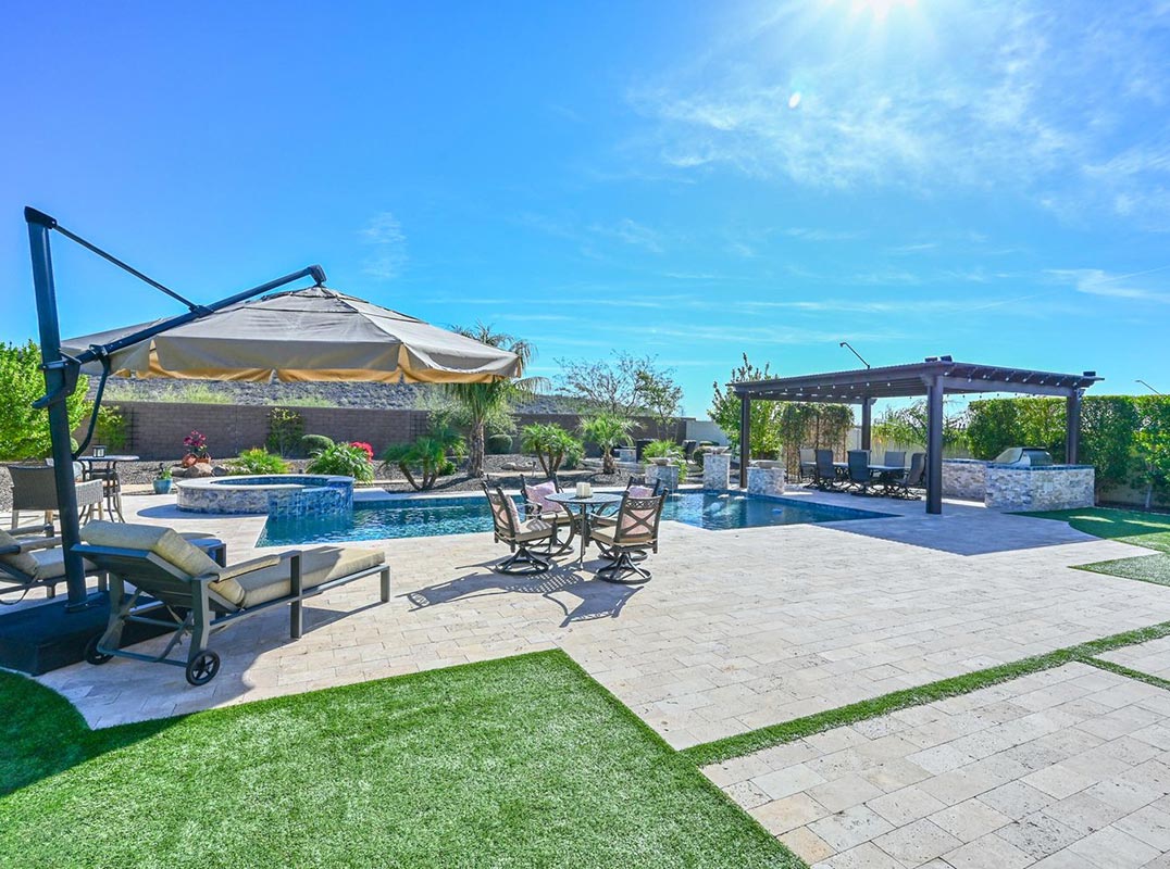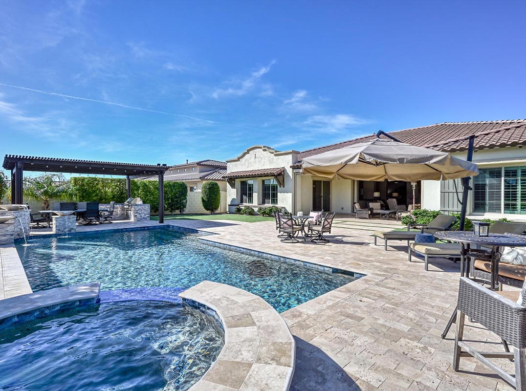 Situated on an oversized 1/3+ acre homesite within the prestigious guard-gated community of Blackstone Country Club at Vistancia in Peoria, this exceptional Toll Brothers Costellana residence offers a true resort lifestyle with privacy and refined upgrades throughout. The upscale backyard features travertine decking, heated pool & spa, fire pit, stone-wrapped BBQ, pergola, and lush landscaping - ideal for luxury entertaining. Inside, soaring 10' ceilings, a dramatic 15' glass pocket door, and a designer white gourmet kitchen with Wolf/Sub-Zero appliances oversized island, leathered granite counters, R/O system and double ovens. The expanded primary suite includes a custom closet and spa-inspired bath. Owned solar and 3-car garage with 4 foot extension complete this rare offering. Spray foam insulated attic for enhanced energy efficiency and comfort; 2X6 construction, custom iron pergola in the gated front courtyard; custom iron/glass front entry door; 4' extensions in the primary suite, breakfast room, and garage; fireplace in great room wrapped in stone, illuminated upper kitchen cabinetry; oversized laundry room with custom floor tile, sink and upper cabinets; indoor/outdoor surround sound; power sun shade; floor-to-ceiling luxury tile shower with soaking tub in the primary bath; low voltage landscape lighting, mature landscaping for added privacy and year-round curb appeal. Blackstone Country Club offers an exclusive private club lifestyle with championship golf, resort-style pool, fitness center, dining, and a vibrant social calendar (membership optional and separate). Convenient North Peoria location near Lake Pleasant Parkway provides quick access to upscale shopping, dining, everyday conveniences, hiking, and outdoor recreation.