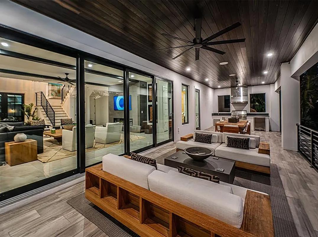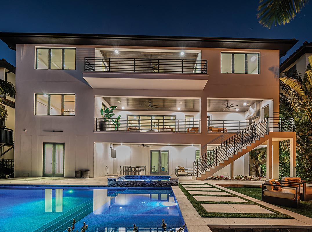 Stunning Pebbletec pool/spa (heated and with salt chlorination system) is encased in a splendid shellstone paver deck, ideal for lounging and entertaining. Adjacent to the waterfront, a lushly-landscaped synthetic grass seating area surrounds a modern gas firepit. This astonishing home includes a dual jet ski with rapid access to open water, a 3-stop luxe elevator, tankless hot water heating, backup power gas generator and so much more.