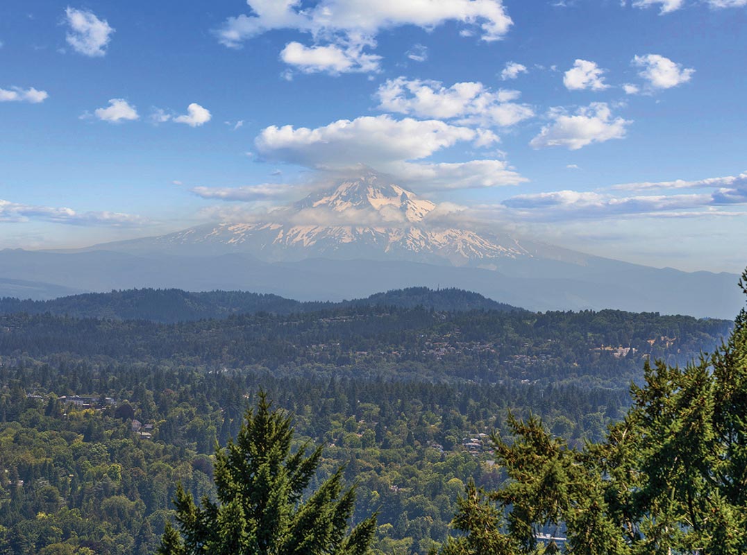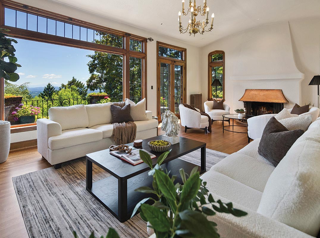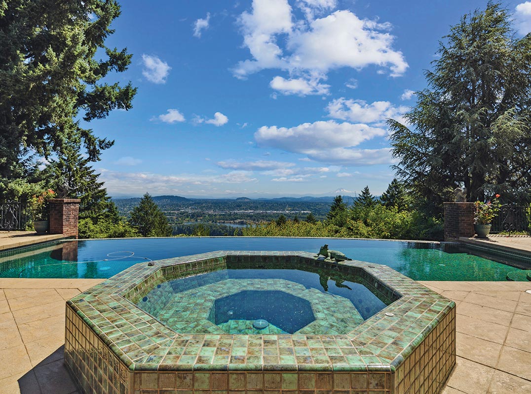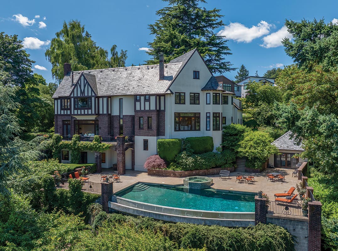 This exceptional 1928 Tudor Revival commands sweeping views of Mt. Hood and the Willamette River. Inside, the home strikes an artful balance between modern comfort and historic authenticity. Rich red oak flooring pairs beautifully with original millwork, custom ironwork, and period brass fixtures. Graceful Tudor archways and coved ceilings evoke Old World craftsmanship alongside leaded glass casement windows with gum wood trim, charming window seats, and a dramatic curved staircase with a hand-forged iron railing. Whether framed by the oversized picture window or enjoyed from the attached balcony, the great room offers stunning river and mountain views, complemented by an elegant fireplace with a hammered copper hood. These views continue in the formal dining room, providing the perfect backdrop for memorable meals. The kitchen marries period charm with modern functionality through rich gum wood cabinetry, granite countertops, multiple sinks, high-end appliances, and a window-lined breakfast nook. The upper level hosts three bedrooms plus the primary suite - a sophisticated retreat with Willamette and Mt. Hood views, a fireplace, and a luxurious bath with a deep soaking tub and custom mosaic tilework. The lower level offers a family room with a floor-to-ceiling brick fireplace, terrace access, and abundant storage. Capitalizing on an unmatched location, an expansive east-facing terrace delivers panoramic views over a heated infinity pool and hot tub, while multiple gathering areas and a pool house with full kitchen allow for effortless entertaining. An adjacent 0.15-acre buildable lot - offered separately - offers future expansion possibilities. Located steps from scenic Terwilliger Parkway and a short walk to the Chart House, the home is bordered to the north by Marquam Nature Park and its 200 undeveloped acres and miles of trails, with the shops and restaurants of South Portland and downtown just minutes away.