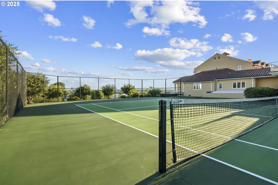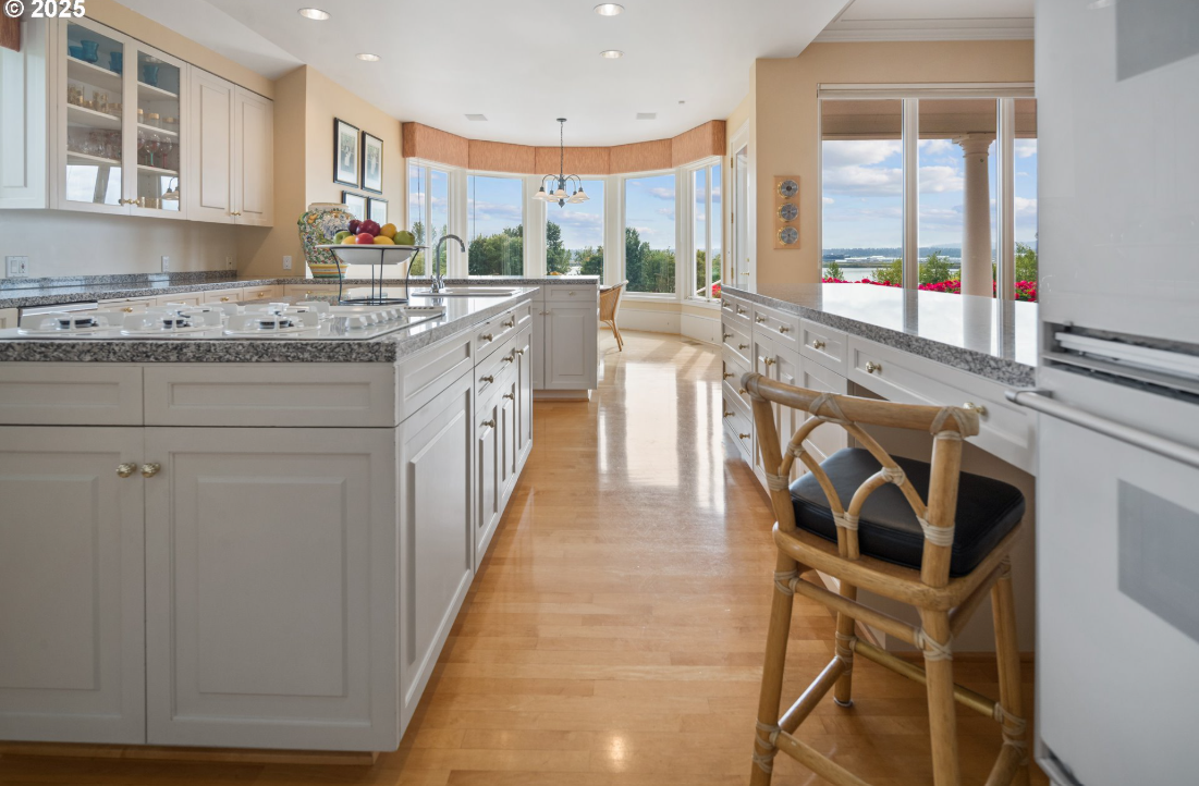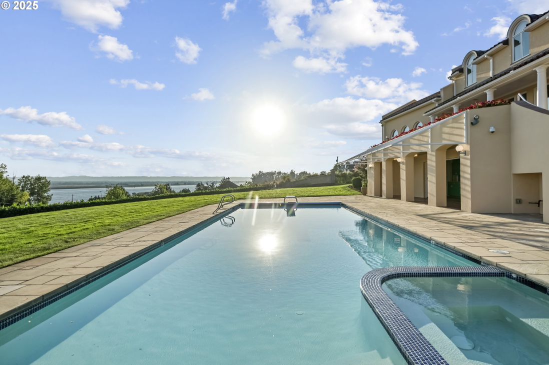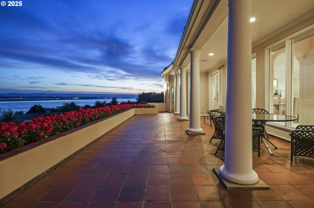 For the first time ever, this remarkable gated estate along the Columbia River is available to the market. It is a rare opportunity to own a residence that blends timeless architecture with grand scale living. Set on 1.58 acres and spanning 6,740 plus square feet, the home captures sweeping river views through walls of glass and stately arched French doors. Soaring ceilings, marble floors, and column lined galleries create a sense of quiet grandeur throughout the main level. Formal living and dining rooms open to terraces overlooking manicured grounds and the river beyond, while multiple fireplaces add warmth and elegance. The chef’s kitchen and breakfast nook are perfectly positioned to enjoy panoramic vistas, complemented by a generous butler’s pantry for effortless entertaining. Five bedrooms and six full, plus two half baths, offer refined comfort, highlighted by a primary suite with a spa-inspired bath, dual dressing areas, and a private fitness room. Two offices allow for multiple work-from-home spaces for the remote work. French doors open to secluded patios ideal for morning coffee or evening sunsets. A separate guest quarters with its own kitchen, fireplace, and balcony provides flexible living for extended stays or multigenerational needs. On the lower level, a spacious bonus room, wine cellar, and direct access to the pool create the perfect setting for relaxation and entertainment. Outdoors, resort-style living unfolds with an inviting pool, expansive terraces, and manicured gardens, all designed to embrace the serenity of riverfront living just minutes from downtown Vancouver and Portland International Airport.