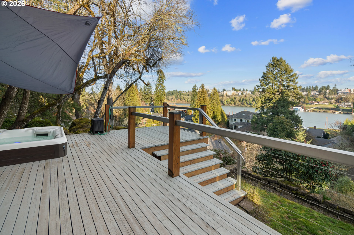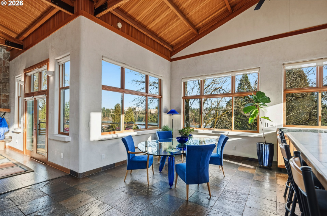 This striking Northwest contemporary offers stunning river views on one of the area's most sought-after streets. Cathedral tongue-and-groove cedar ceilings extend from the living room to the primary suite, accented by skylights that flood the interior with natural light. Hand-selected Douglas fir posts and exposed timber-truss beams highlight Pacific Northwest craftsmanship. Engineered hardwood floors and oversized windows create a bright, airy feel, while an eco-friendly mini-split system ensures year-round comfort. The living room is anchored by a floor-to-ceiling stone gas fireplace beneath soaring ceilings. French doors open to an expansive back deck with hot tub, outdoor shower, and sweeping river views. A media loft overlooks the space and connects to a bedroom with en suite. In the kitchen, an Elmira Northstar midcentury-style gas stove is paired with river views, slate floors, and abundant storage. A center island seats four and features a double bowl drainboard sink, with a second sink offering added convenience. Set on its own wing, the primary suite features deck access and a stacked stone gas fireplace. The en suite includes a double vanity, deep soaking tub, and walk-in closet with built-in storage, while an adjacent loft provides an ideal home office. Downstairs, two bedrooms overlook the river, each with access to a lower patio. A laundry room and storage room complete the lower level. Additional features include a powder room at entry, sound system, and extra-deep 2-car garage. Built with advanced Rastra composite insulated concrete form (ICF) construction and structural insulated panel (SIP) roofing, the home delivers exceptional energy efficiency, superior soundproofing, and structural strength up to 7x that of wood-frame construction, finished with plaster interior walls and durable stucco exterior. Located in one of the state's top-rated school districts, minutes from downtown Lake Oswego.