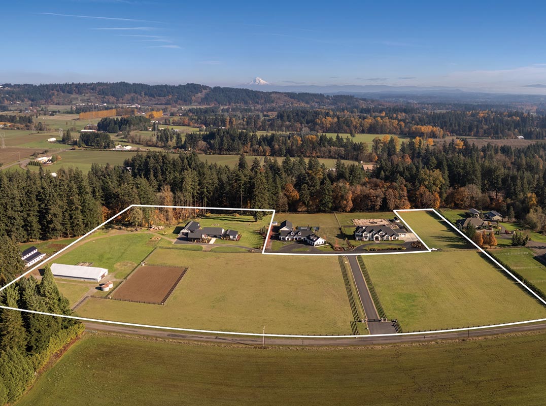 Luxury contemporary single level custom-built home on 15.79 fully usable acres in one of Wilsonville's most desirable rural settings. Designed by architect Troy Fowler and constructed by NW Natural Street of Dreams, award-winning builder, Elite Development Northwest. Offering 5,436 sqft of thoughtfully designed living space. Expansive ceilings & windows flood the interior with natural light, while white oak hardwood floors & designer lighting create warmth & sophistication throughout. With six bedrooms, including two luxurious primary suite & five full bathrooms, the layout is both functional & refined. A beautifully appointed separate living space provides ideal flexibility for guests, or multi-generational living. The entertainer’s kitchen is equipped with Sub-Zero & Wolf appliances, quartzite & quartz countertops, & premium Rohl fixtures, seamlessly blending performance with design. Spa-inspired bathrooms feature Victoria + Albert volcanic limestone soaking tubs and elevated finishes that create a true retreat experience. Beyond the residence, the property is fully equipped to support agricultural pursuits or an equestrian lifestyle. Privately gated with a paved drive and secondary farm access, the acreage is framed by over 4,000 linear feet of classic four-rail wood fencing, creating two expansive pastures and multiple open field areas. A fenced 180’ x 100’ outdoor dirt arena provides dedicated space for training. The 110’ x 50’ renovated barn, originally built in 1935, blends timeless character with modern functionality. It offers four spacious stalls with generous run-outs, a heated tack room, heated bathroom with washer and dryer, wash rack with hot water, storage room, and two striking 14-foot diameter silos with concrete floors. An irrigated garden area & a private approximate two-acre forest area further enhance the land's beauty and versatility. Excellent & convenient location, just minutes from I-5 access and & local amenities.