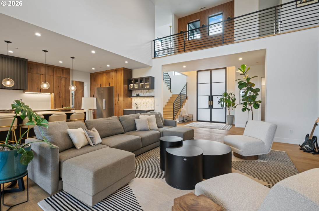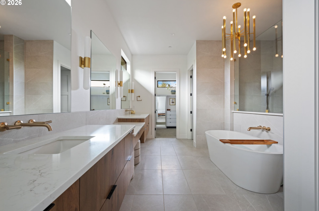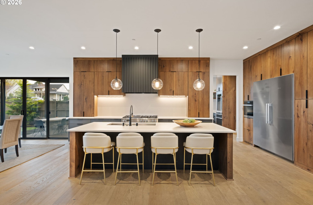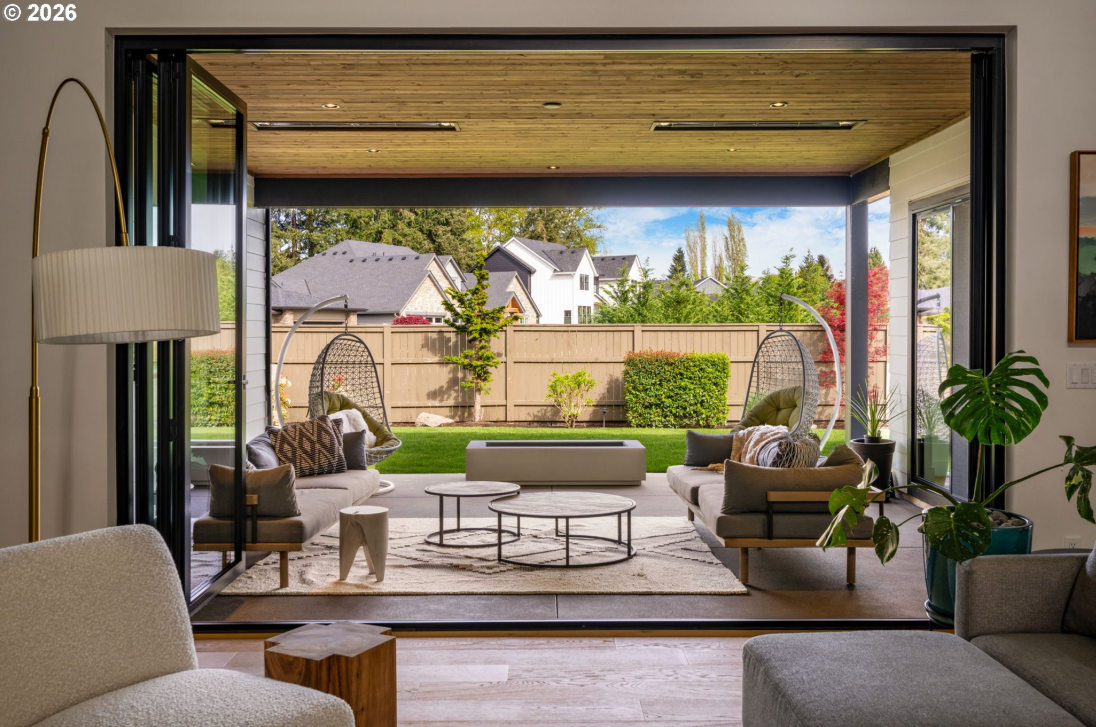 This professionally designed 4-bedroom, 4-bath home blends timeless style with thoughtful functionality throughout. An impressive 11-foot custom glass and iron front door opens to a bright, expansive two-story great room, anchored by a hand-textured floor-to-ceiling fireplace. LaCantina accordion doors create seamless indoor-outdoor living, leading to multiple dining areas and beautifully designed outdoor spaces. Enjoy year-round entertaining with built-in heaters, a custom gas concrete fireplace, and a fully equipped outdoor kitchen.The kitchen is both clean and timeless, designed for gathering and everyday living. Rustic hickory cabinetry extends to 10 feet, paired with high-end Miele appliances, a large island with a Galley workstation sink, and a beverage area with built-in wine cooler. Step off the kitchen to the oversized Butler’s Pantry that adds both function and charm, perfect for bread making, pizza nights, and entertaining. A convenient service window connects directly to the outdoor dining area and full gas Hestan grill.The owner’s suite offers a peaceful retreat, featuring a Venetian hand-plastered, gold-embossed accent wall. The spa-like primary bath includes a double vanity, a large walk-in shower with dual shower heads, a soaking tub, heated floors, a Jonathan Adler chandelier, and soft porcelain tile for a truly relaxing experience. The main floor features a practical and beautiful mudroom, flexible office spaces and a state of the art gym with roll-up garage door. Upstairs, you’ll find two additional bathrooms, two generously sized bedrooms, and a bonus room with a beverage bar—ideal for guests or flexible living. This is a home that truly stands out—thoughtfully designed, beautifully finished, and ready to enjoy.