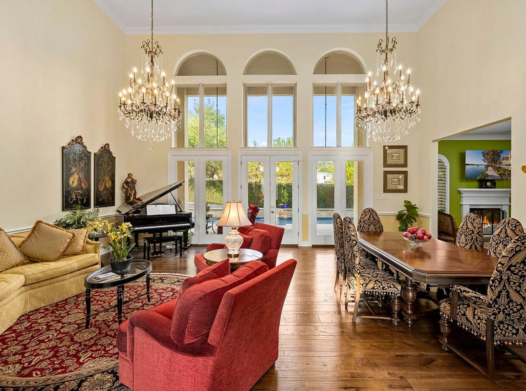 The newly updated gourmet kitchen is a chef's dream, featuring a stunning granite island with bar seating, a farmhouse-style copper sink, Miele dishwasher, Jenn-Air 6-burner gas range and refrigerator, and an additional wall oven. The kitchen opens to a cozy breakfast area and spacious family room-perfect for connecting with guests while preparing meals. The main-level owner's retreat offers a peaceful sanctuary with a large bedroom, spa-inspired bath, and dual walk-in closets. A private study and an additional guest suite complete the first floor. Two dramatic staircases lead to the second level, where you'll find three generously sized bedrooms, a home management center, a game room, and a media room-ensuring ample space for work, play, and relaxation. Step outside to a resort-style backyard, recently enhanced with a sparkling Canyon Creek pool and spa, complete with soothing waterfalls. A new pergola frames the outdoor living area, featuring a built-in stone fireplace and fully equipped outdoor kitchen with Bull grill, refrigerator, prep counter, and storage. The lush, tree-canopied yard offers shaded areas ideal for quiet reflection or al fresco entertaining. This home delivers the ultimate in refined living and entertaining-don't miss the opportunity to make it yours!