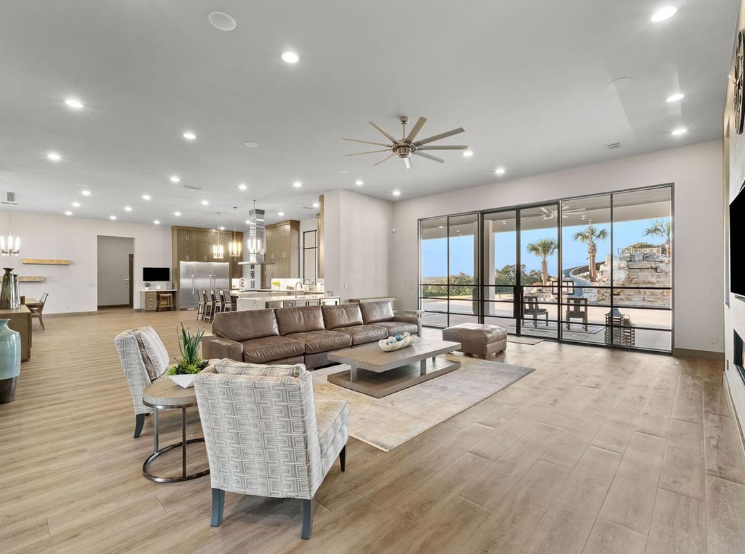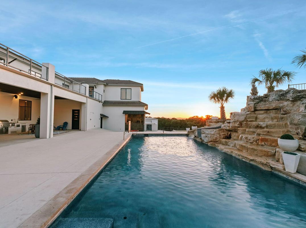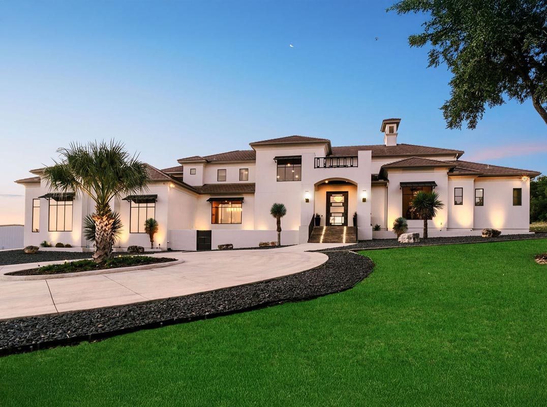A rare combination of unmatched luxury and unrestricted acreage to enjoy! This Hill Country oasis offers over 8,500 sqft of living space, a sparkling pool, and a 2,000 sqft air-conditioned shop, all nestled on 5.14 acres. The home comes fully furnished with designer furniture, making it move-in ready with high-end style and comfort. Supreme long-range views captivate you from every direction-enjoy firework shows from the front deck or take in the untouched beauty of the wildlife preserve from your back patio. The contemporary Mediterranean style draws you up from the private gated entrance to the stately circular drive and meticulously landscaped grounds. Inside, the modern, elevated finishes make an immediate impression. The gourmet kitchen is a chef's dream with Thermador appliances, Quartzite countertops, 2.5 ovens, warming drawer, double refrigerators, and a walk-in pantry with towering storage. The primary suite is a luxurious retreat with soaring 18-ft ceilings, pendant lighting, and dual bathrooms each with its own walk-in closet. Perfect for multi-generational living or long-term guests, the home includes a full guest quarters featuring its own kitchen, living space, private entrance, and garage. An additional first-floor bedroom offers flexibility as an office. Upstairs, the living spaces and possibilities continue with a large open space for entertaining, a media room, and a bonus room. The 2,000 sqft shop is a standout feature, fully air-conditioned with a full bath, covered equipment parking, and a back service road for convenient access all in addition to the home's 4-car attached garage. With no HOA and no restrictions, bring your animals, hobbies, or even your business. Located in Comal ISD. Welcome home!