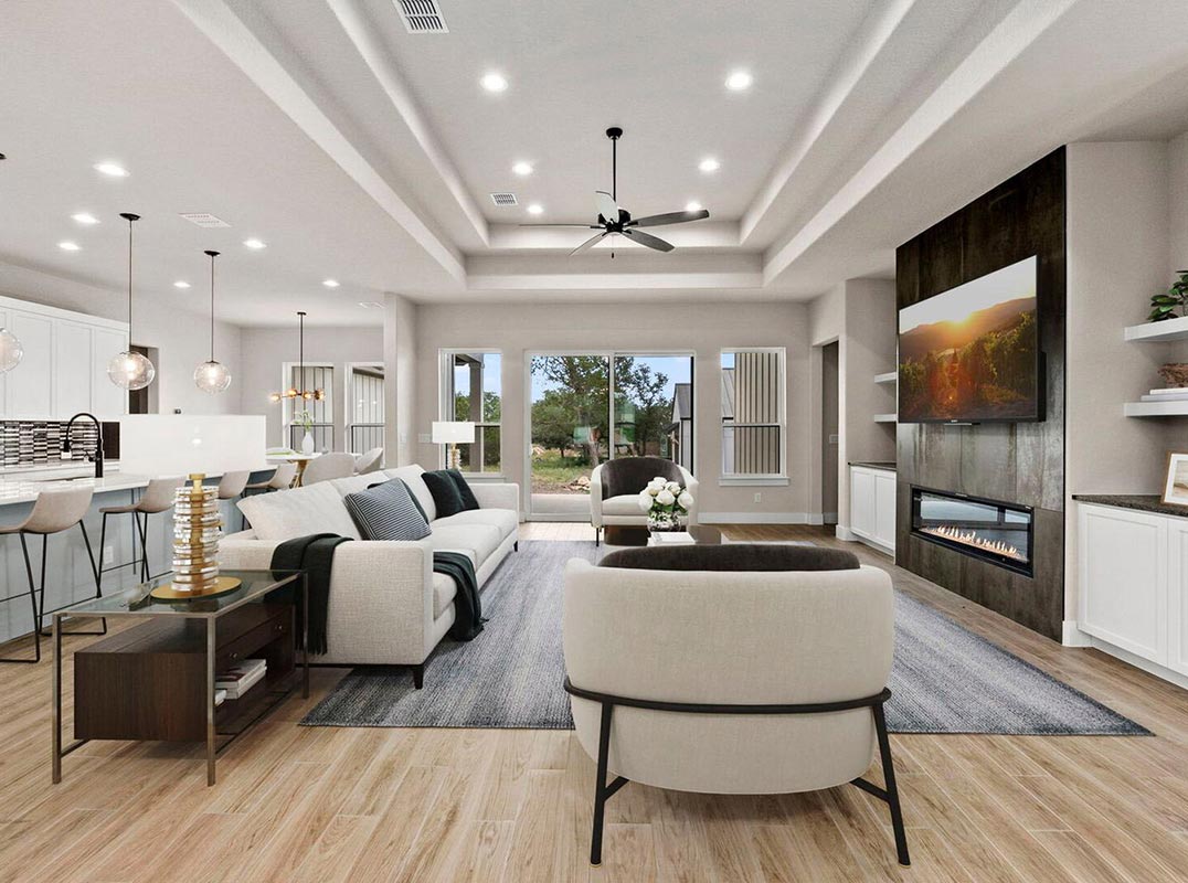 Welcome to this beautifully crafted new build by Macaw Custom Homes, nestled in one of Wimberley's most sought-after gated communities. Thoughtfully designed with versatility and elegance in mind, this spacious home perfectly suits growing families and avid entertainers alike. Enjoy the convenience of single-level living with a smartly laid-out main floor featuring three generously sized bedrooms, three and a half bathrooms, and a private study. Upstairs, a secluded fourth bedroom with a full ensuite bath offers the ideal retreat for guests or multigenerational living. The heart of the home is the chef-inspired kitchen, adorned with Quartz countertops, a sleek modern backsplash, and premium GE Cafe appliances.