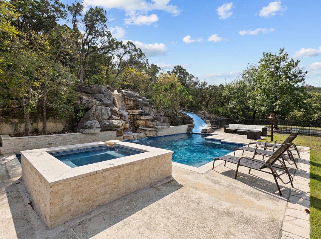 Experience refined Hill Country luxury at 10924 Reyes Canyons in Helotes, TX. Set on 2.68 private acres, this exceptional estate offers resort-style outdoor living, grand architectural details, and thoughtfully designed interiors tailored to today's luxury lifestyle. The exterior makes a striking first impression with a circular drive, mature landscaping, and multiple garages including a 3-car oversized attached garage plus a 1-car detached garage, ideal for car enthusiasts or additional storage. The backyard is a true private resort, featuring a luxury pool with spa, waterfall, and slide, multiple outdoor living and entertaining areas, and a huge covered patio perfect for hosting year-round. A sport court offers space for basketball or pickleball, while a dedicated dog run adds everyday convenience. Surrounded by Hill Country views and natural privacy, this property is designed for both relaxation and entertaining on a grand scale. Step inside to a breathtaking foyer with a grand staircase, complemented by a secondary back staircase for seamless flow throughout the home. Richly refinished hardwood floors, soaring ceilings, and abundant natural light immediately set the tone for elegance and timeless design. This expansive residence offers six bedrooms, five and a half bathrooms, and an impressive four living areas, including a formal living room, family room, piano room, and an upstairs secondary living space.