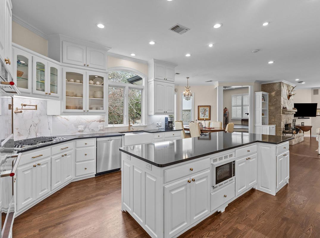 At the heart of the home is an updated chef's kitchen, featuring quartz countertops, Calacatta backsplash, champagne bronze hardware, a farmhouse sink, double ovens, gas cooking, and a pot filler, all designed to meet the expectations of discerning buyers. A butler's pantry and wet bar enhance entertaining, while the formal dining room comfortably accommodates seating for twelve or more. Two fireplaces add warmth and architectural interest throughout the main living spaces. The primary suite is located on the main level, offering a private retreat with direct outdoor access, a spa-like bathroom, his and hers walk-in closets, and a private laundry area within the primary bath. An additional laundry room on the main level provides added convenience. A first-floor executive study offers the ideal work-from-home environment. Upstairs, you'll find five generously sized bedrooms. Two pairs of bedrooms are arranged in Jack-and-Jill configurations offering functional layouts for family or guests. One upstairs bedroom features its own living room and full bathroom, making it ideal as a secondary primary suite, guest suite, au pair quarters, or multigenerational living space. A finished attic provides additional flexible space for storage, a playroom, or recreational use. Located within Los Reyes Canyons, one of Helotes' most sought-after luxury gated communities, residents enjoy privacy, custom estates, Hill Country scenery, and abundant wildlife, all just minutes from top-rated Northside ISD schools, shopping, dining, and the charm of Downtown Helotes. This home offers the rare combination of acreage, amenities, and architectural elegance that luxury buyers seek. Schedule your private showing and experience the best of Los Reyes Canyons luxury living.