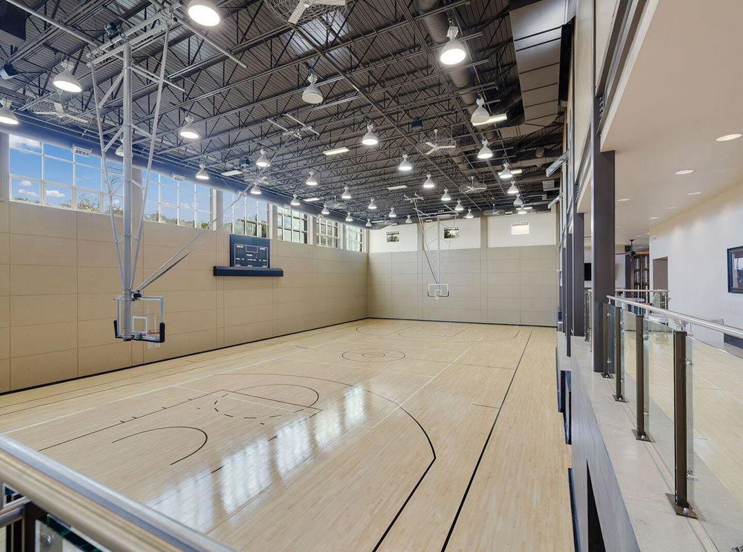 Guest accommodations within the main residence are generously proportioned, offering privacy and comfort throughout. A detached guest house provides complete independence and architectural character, with vaulted wood paneled ceilings, Cantera stone fireplace, private living quarters, loft space, and immediate access to outdoor grilling and entertaining areas. Completing the compound is a purpose-built sports and wellness pavilion constructed with commercial-grade steel integration across three levels. This facility includes a full size indoor basketball court, regulation racquetball court, comprehensive weight training area, resistance pool, sauna facilities, multiple restrooms, a full service chef’s kitchen, game and viewing lounge with double-sided fireplace, and rooftop-level entertaining spaces. Outdoor living is equally refined, with extensive flagstone and herringbone-patterned brick decking, masonry stone walls, resort-style pool and spa with a waterfall and elevated hot tub, and multiple covered patios designed for gathering and leisure. The property is supported by a side entry garage, expansive motor court, and additional parking serving the sports pavilion, providing seamless circulation for residents and guests while supporting hosting at scale with ease and discretion. Mature landscaping and water features frame the grounds, creating a private and composed estate environment befitting its stature.