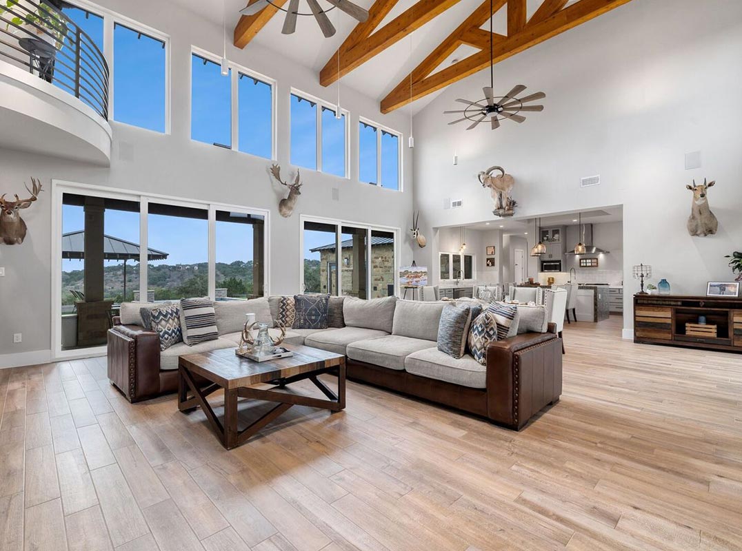 Set across rolling ag exempt acreage in the heart of the Texas Hill Country, this exceptional estate offers privacy, scale, and architectural presence framed by expansive long range views. Designed to balance refined living with meaningful recreation, the property pairs a thoughtfully executed main residence with an impressive climate controlled car barn, creating a setting suited for both everyday comfort and elevated gatherings. The main residence spans approximately 5,142 square feet and is positioned to capture the surrounding landscape from nearly every room. Natural stone, warm wood accents, and extensive glass define the exterior, while covered balconies and outdoor living areas extend the home outward and reinforce its connection to the land. Inside, the interiors are defined by generous proportions, soaring ceilings, and a layout that feels open yet intentional. Walls of glass introduce abundant natural light while maintaining strong visual continuity throughout the home. The kitchen serves as a central gathering space, appointed with a six burner gas cooktop with integrated grill, custom cabinetry, an oversized island, and designer quartz countertops. The space is equally suited for daily use and larger scale entertaining. The primary suite offers a private retreat overlooking the surrounding terrain. The spa inspired bath includes a steam shower, expansive custom closet space, and an additional hidden bonus area providing flexibility for a variety of uses. The suite is intentionally separated from secondary living areas to enhance privacy.