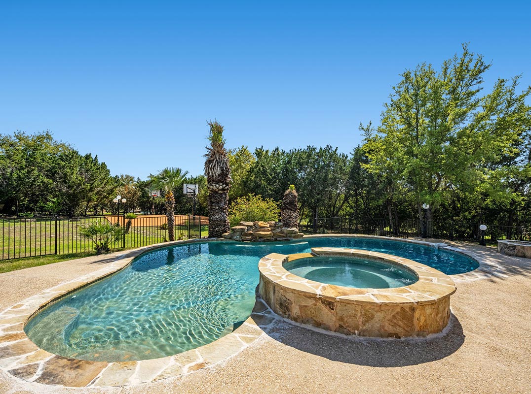 Welcome to this stunning two-story custom estate on 1.75 acres in the prestigious gated community of Menger Springs Estates. With 5 beds, 3.5 baths, and 5,718 sq ft of luxury living, this home offers space, comfort, and style. Step through elegant French doors into your Texas Hill Country getaway, featuring a beautifully landscaped backyard with a heated pool and spa, a waterfall feature, a full basketball court, a volleyball court and a cozy fire pit-perfect for cool Texas evenings. Inside, the open-concept layout showcases hardwood and porcelain tile floors throughout. The chef's kitchen is built to impress with a massive island that seats 10+, granite countertops, custom cabinetry, four convection ovens, a glass electric cooktop, gas stove with indoor grill, pot filler, and built-in hot/cold water dispensers. The primary bedroom with a sitting area, double-sided fireplace, and a spa-like bath with dual vanities, dual showers, whirlpool tubs, two walk-in closets, and its own laundry hookups with space for a fridge and microwave. A secondary bedroom with an en-suite bath and walk-in closet is also located on the main floor. Just minutes from La Cantera, The Rim, and The Dominion! Boerne ISD. Welcome home!