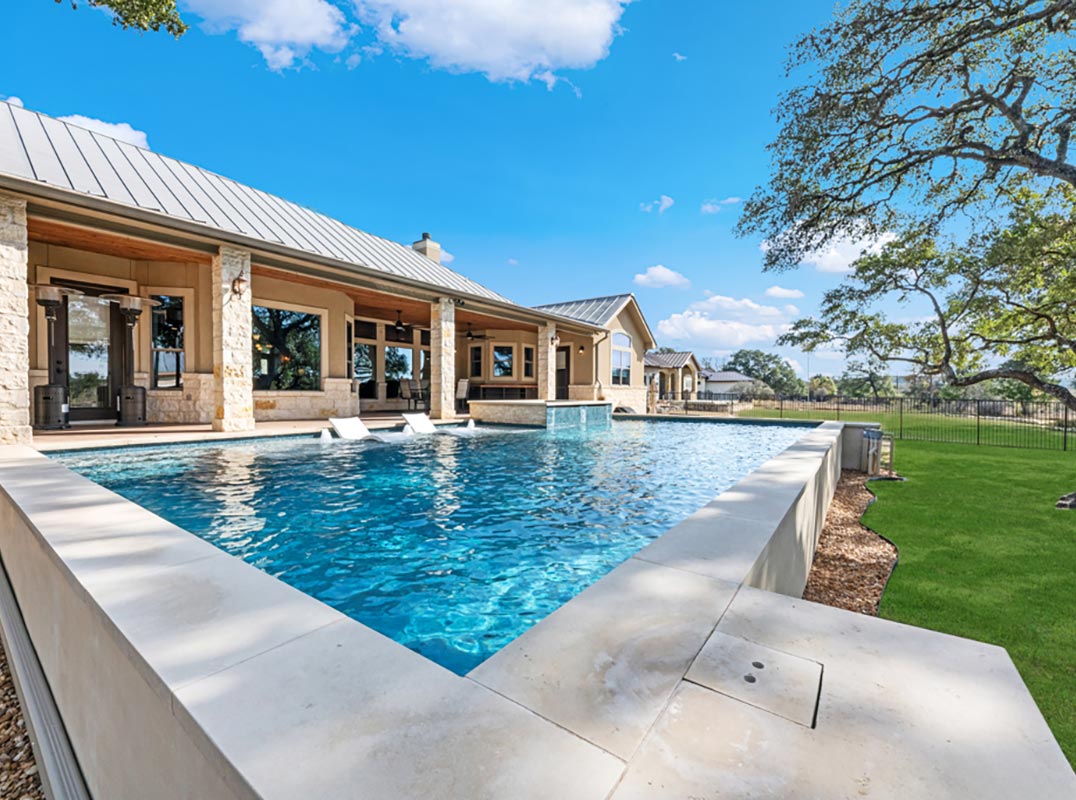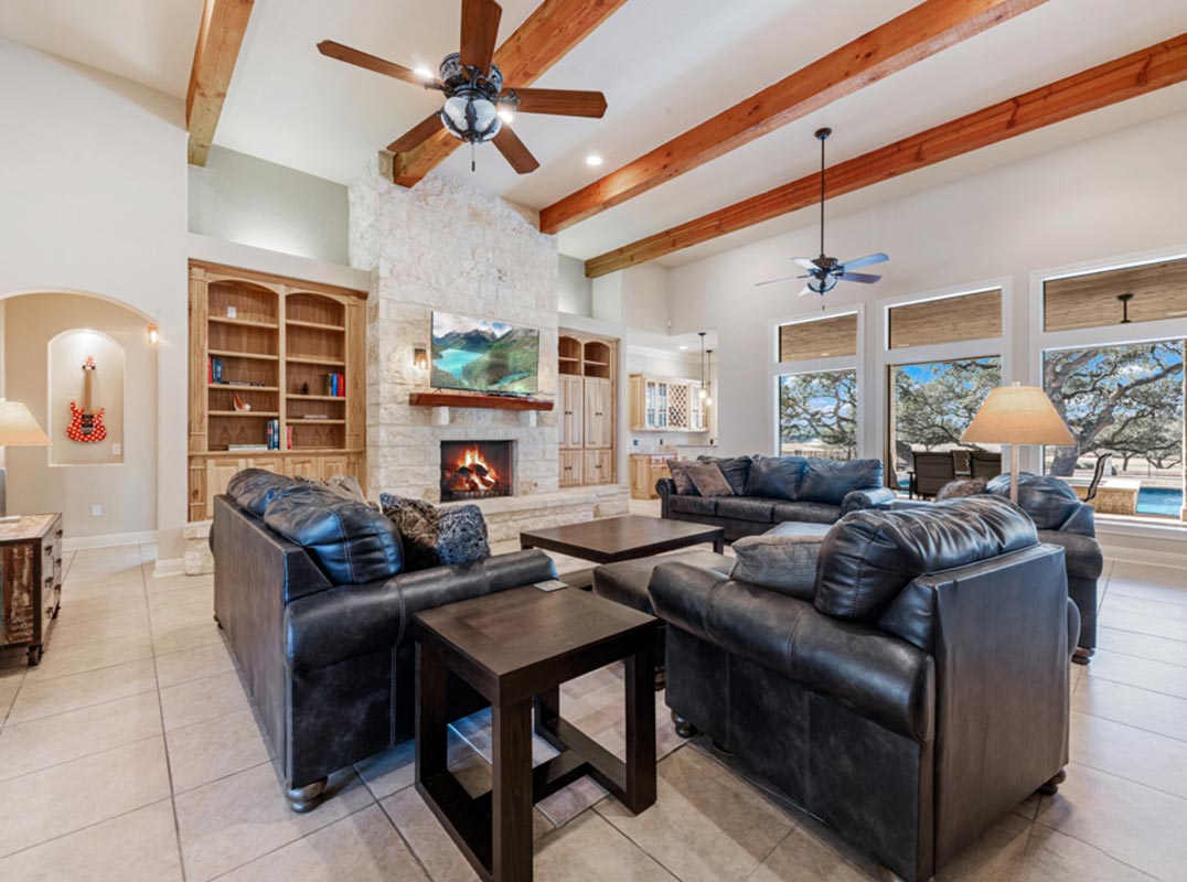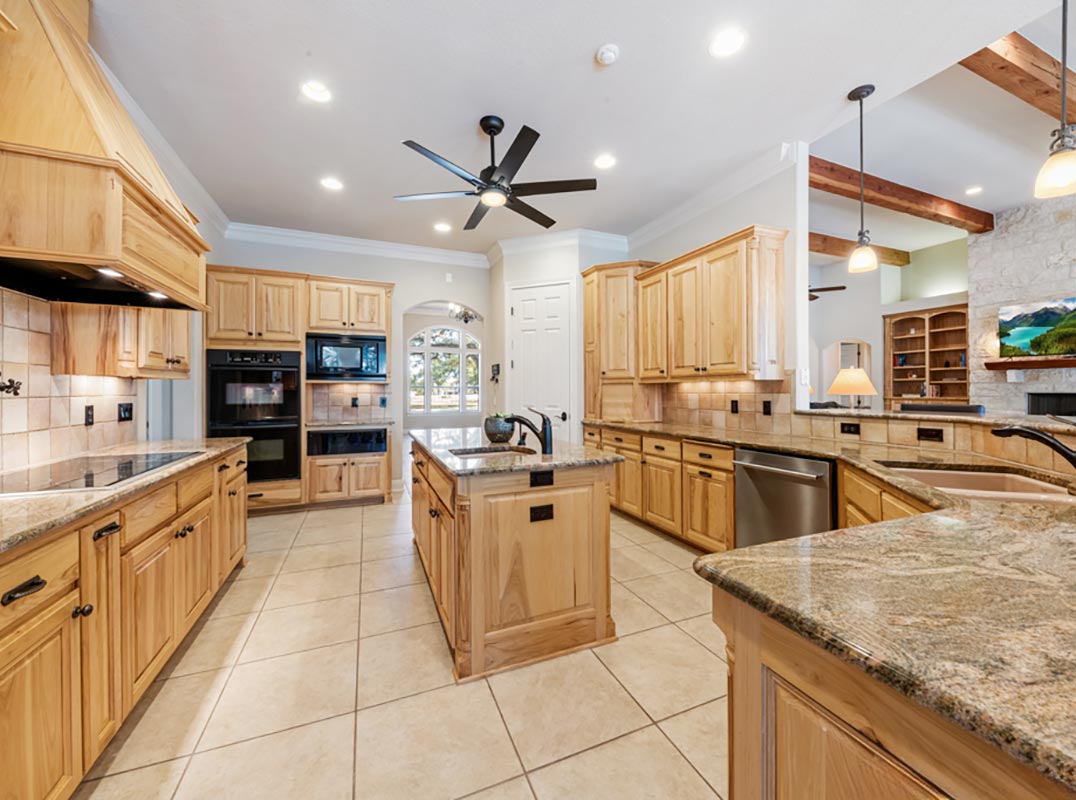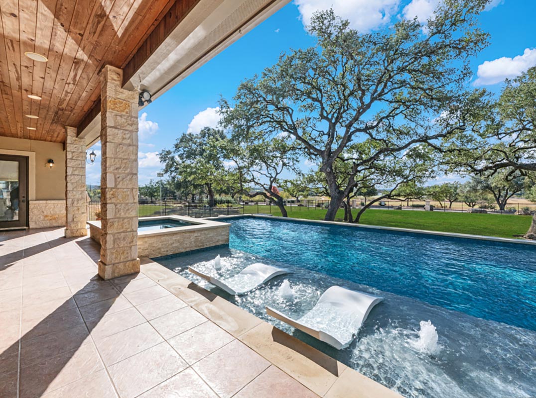 Stunning one story estate located in the gated community of The Waters of River Crossing. This exceptional 4,600+ sq. ft. home offers breathtaking panoramic backyard views of holes 1 & 2 and the pond of River Crossing Golf Course. Thoughtfully designed for entertaining and everyday luxury, this residence features 4 bedrooms, 3.5 baths, with the 4 bedroom being versatile as a secondary suite ideal for a study, guest space, or flex room. The chef's kitchen is a true showstopper, complete with custom hickory cabinetry, double wall ovens, warming drawer, pot filler, built-in ice maker, prep kitchen, two walk-in pantries, oversized island with veggie sink, instant hot water, slide-out cutting boards, pull-out spice racks, and abundant storage. The private primary suite offers exterior access, tray ceilings with accent lighting, and a beautiful bay window. The spa-like primary bath features dual vanities, a soaking Jacuzzi tub, and an expansive walk-through shower. The custom walk-in closet includes built-ins and a full-length mirror. The living room showcases wood beam ceilings, a gas-start stone fireplace with wood mantle, custom built-ins, and expansive windows framing views of mature oaks and the golf course. A wet bar seamlessly serves both the living room and patio, making it perfect for indoor and outdoor entertaining. Step outside to a backyard designed for resort-style living, featuring a high-end custom pool with spa that is less than two years old, perfectly positioned to take in the serene golf course and water views. Exceptional setting for both relaxation and entertaining. Bedrooms 3 and 4 feature tray ceilings, private vanities, and walk-in closets. The game room boasts vaulted ceilings, wood beams, and exterior access. Additional highlights include surround sound inside and out, central vacuum, circular drive, and a spacious laundry room with cabinetry, sink, built-in ironing board, and convenient access from the primary suite. The oversized 3-car garage includes cabinetry, counter space, room for a freezer, plus an additional workshop with exterior access. Exceptional quality construction, remarkable features, and an unbeatable setting-this home is truly a must-see to fully appreciate. Easy Access to 281, school, restaurants and shopping.