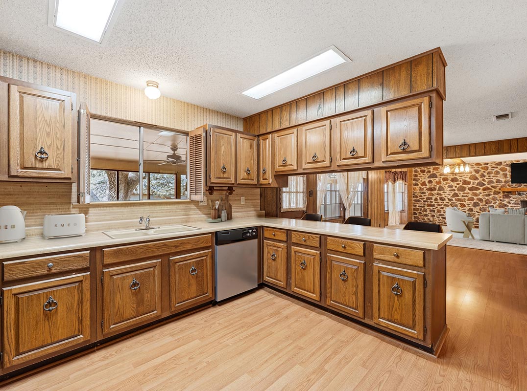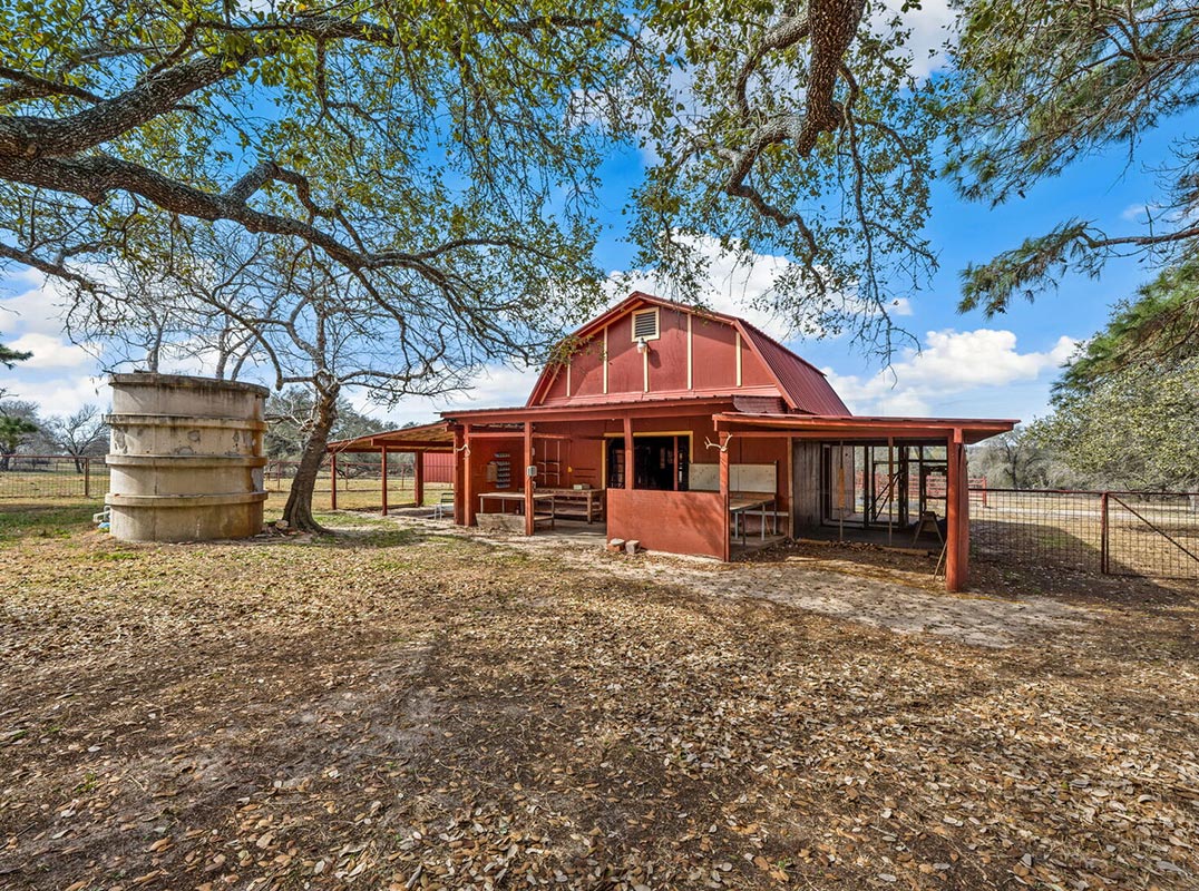 Under a canopy of sprawling oaks, where the breeze moves easily through the trees and ponds shimmer in the distance, this cherished Texas ranch invites you to slow down and stay awhile. Held in the same family for many years, this is the first opportunity to carry its legacy forward - a beautiful country setting ready for its next chapter and a buyer who will continue its story and traditions. A striking red metal roof crowns the stone exterior, rising from just over 79 acres of usable land that feel private, established, and full of possibility. Deer graze peacefully in the distance, stunning mature trees frame the landscape, and two stock ponds - one well-fed and one rain-fed - offer inviting places to fish, swim, or gather for easy summer picnics beneath a wide Texas sky. Inside, warm wood-look flooring leads into a welcoming living room anchored by a floor-to-ceiling stone fireplace and exposed beams - the kind of space where evenings stretch a little longer. The kitchen offers abundant cabinetry, generous counter space, and a breakfast bar that keeps everyone connected, whether it's morning coffee or a weekend gathering. With four bedrooms and two and a half baths, there's room for family, guests, hobbies, or a quiet home office. A long screened porch overlooks fenced and cross-fenced pastureland, while a barn with working pens and additional outbuildings support both ranching and recreation. Though it feels worlds away, convenient access to Highways 37 and 281 makes commuting simple, blending peaceful country living with everyday practicality. Please be aware that some photos have been virtually staged.