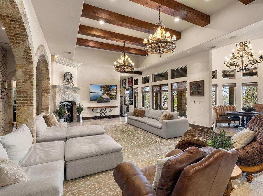 This custom Mediterranean villa is nestled on 13.85 private acres and features panoramic Hill Country views and the utmost privacy! The entertaining enthusiast will appreciate the elaborate living and dining spaces, which all boasts, floor to ceiling windows, framing some of nature's finest views and creating warm and inviting spaces throughout. A majestic entrance offers a welcoming introduction to the sprawling foyer accented by dual galleries with elegant sconces, slurried brick groined ceiling treatments and stone-cut travertine flooring. The grand dining room is ideal for any scale gatherings and features an eye-catching chandelier and an adjacent butler's pantry. For the culinarian, the commercial kitchen features double islands, upscale stainless steel appliances, an abundance of custom cabinetry and workspace, detailed backsplashes and opens to the captivating great room with a fireplace and superb breakfast nook. Every detail throughout the interior is carefully designed and masterfully finished, from the 13 ft. custom entry doors to a lavish wine tasting or cigar room and a 1,500 plus bottle wine cellar featuring 100+ year old reclaimed wood flooring from a tobacco shed in South Carolina. The owner's wing exudes relaxation and features an elegant spa-infused bath with a steam shower and an exercise room, allowing you to experience spa treatments everyday without leaving home.