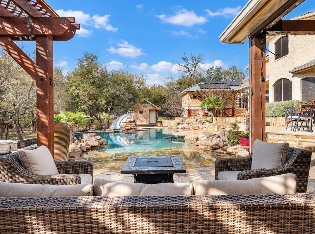 Hidden behind the gates of the prestigious Retablo Ranch community, this remarkable 8.26-acre Hill Country estate offers the rare opportunity to experience true privacy, space, and luxury living just minutes from San Antonio. Designed and built by respected custom builder J. Long, the nearly 5,600-square-foot residence blends timeless Hill Country architecture with expansive interiors that feel both impressive and welcoming. From the moment you pass through the neighborhood gates and continue through a second private entrance leading into the estate itself, mature trees and sweeping countryside views create an immediate sense of calm and seclusion, setting the tone for a home designed around comfort, entertaining, and everyday enjoyment. Inside, soaring ceilings and multiple living areas provide space to gather and unwind, while the chef's kitchen features custom cabinetry, granite countertops, gas cooking, double ovens, and an oversized island naturally becomes the heart of the home. The private primary suite offers a peaceful retreat with a sitting area, spa-inspired bath, and direct outdoor access, allowing you to step outside and take in the quiet beauty of the surrounding landscape. Upstairs and throughout the home, additional bedrooms, a game room, and flexible living spaces provide room for family, guests, and hobbies alike. Outdoors, the property transforms into a true Hill Country escape with a pool and spa, covered patios, outdoor kitchen, and expansive views that make sunset evenings and weekend gatherings unforgettable. The estate also benefits from Tesla solar panels already installed, providing enhanced energy efficiency. The acreage offers exceptional versatility with room for recreation, horses, or future expansion, while the large workshop, RV or boat storage, and extensive garage space make the estate equally functional for those who value both luxury and practicality. Properties offering this level of privacy, land, and custom quality within a gated community so close to San Antonio are exceptionally rare, making 16227 San Cayetano a unique opportunity to own a true Hill Country retreat.