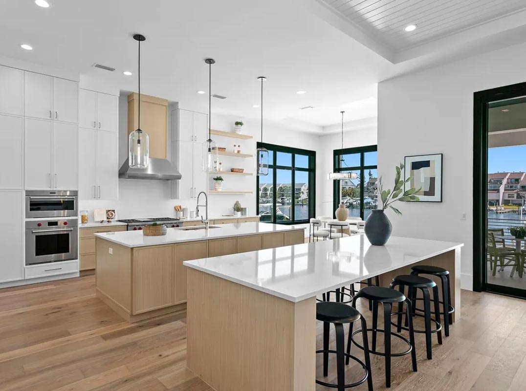 Built to elevated standards, this commanding and impressive residence pairs timeless elegance with modern coastal design. A grand foyer with soaring ceilings welcomes you into a light-filled living room with statement lighting and expansive sliding glass doors, all framing sweeping water views. An open chef's kitchen provides for decadent entertaining with dual islands, quartz waterfall countertops, top-of-the-line Wolf and Sub-Zero appliances, a full-size Sub-Zero beverage refrigerator, along with a butler's pantry, and an additional walk-in pantry. The first-floor primary suite delivers a private waterfront retreat with serene water views, automated shades, dual custom walk-in closets, a laundry area, and an opulent spa-inspired bath with floating dual vanities and a marble wet room with soaking tub. Additional first-floor spaces include a breakfast area with panoramic water views, office, powder bath, laundry room, and mudroom.