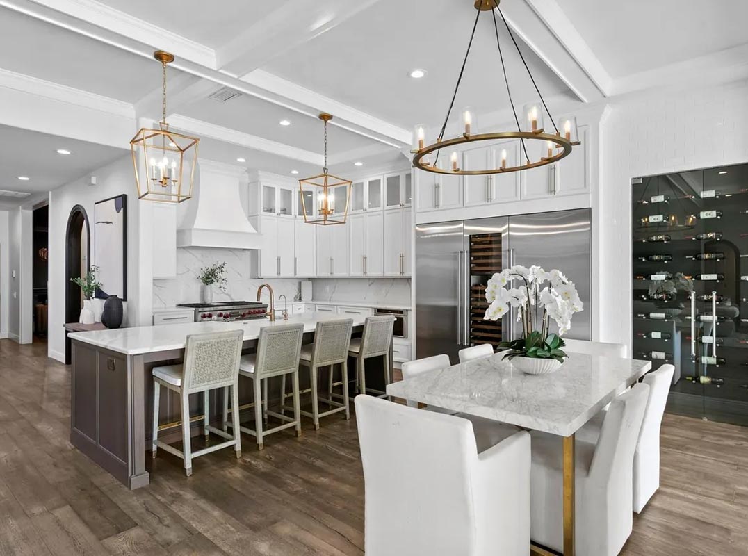 Additional first-floor living spaces include a wainscoted game room with an adjacent study or dining room, offering flexibility for everyday living. The kitchen includes quartz countertops, Sub-Zero, Thermador, and Wolf appliances, a 6-burner gas range, wine refrigeration, a wine storage feature wall, and a dining area positioned to capture natural light and waterfront views. The first level also features a guest suite, laundry room, and a pool bath with convenient exterior access.