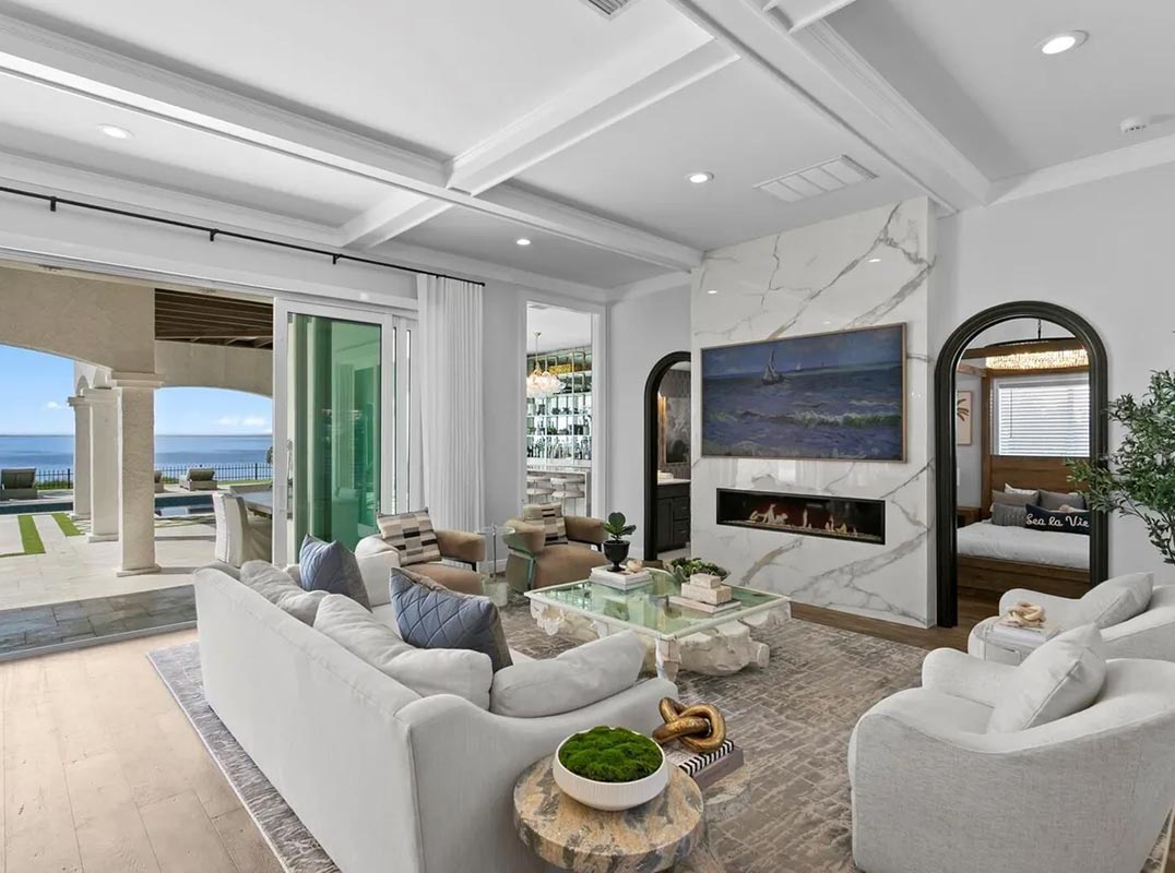 The main living area has been reimagined with an open-concept design, anchored by a fireplace feature wall and expansive glass doors that frame water views and provide seamless access to the covered lanai. A dedicated lounge with custom bar features a fireplace, a waterfall-edge stone island, custom cabinetry, and mirrored accent walls with integrated shelving.