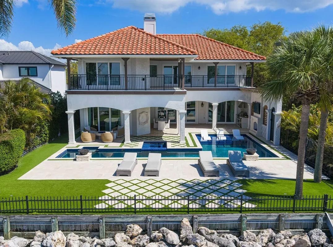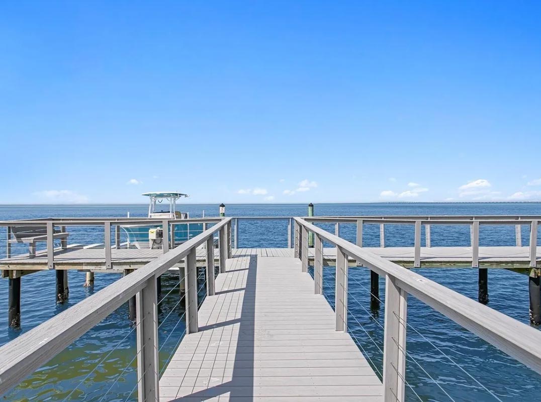 Featuring wide open bay views, 5,175 square feet of living space, and extensive designer-curated upgrades. Embrace a refined waterfront lifestyle on the bay with a boat slip/lift and resort-style outdoor living. A circular paver driveway leads to a covered entry framed by arched architectural details, illuminated by gas lanterns and featuring an imported handcrafted carved wood door. Inside, a dramatic two-story foyer boasts a sweeping staircase, custom iron balusters, and statement chandelier. Wide-plank hardwood flooring, coffered ceilings, custom lighting, wood beam accents and elevated ceilings carry throughout the home.