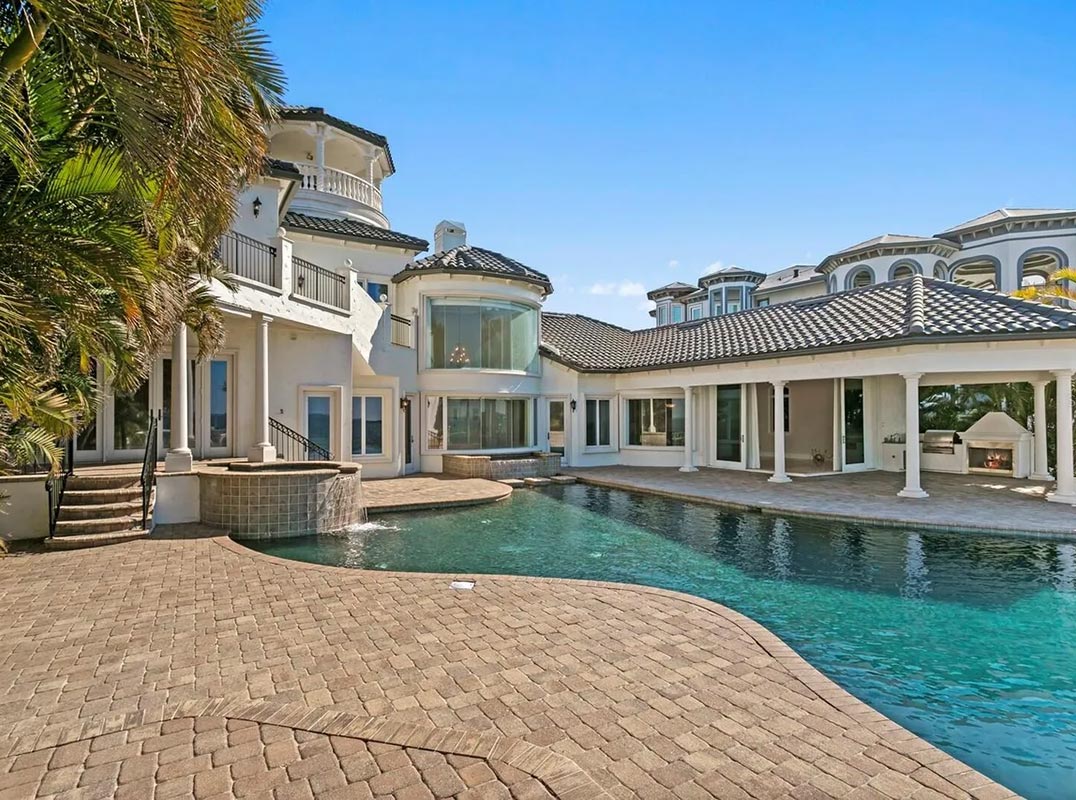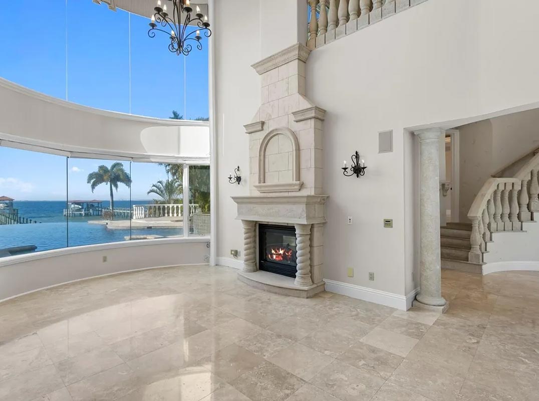 A gated entry and palm-lined drive create a gracious arrival to a residence that showcases timeless Mediterranean architecture, travertine flooring, and elegant architectural detailing throughout. A charming courtyard with a koi pond, framed by wrought iron gates, guides you to interiors defined by soaring ceilings and walls of glass that capture expansive water views. Mediterranean columns, a formal dining room, climate-controlled wine cellar, and a sweeping staircase enhance the home’s architectural presence, while a dual-sided fireplace anchors the main living area with warmth and sophistication.