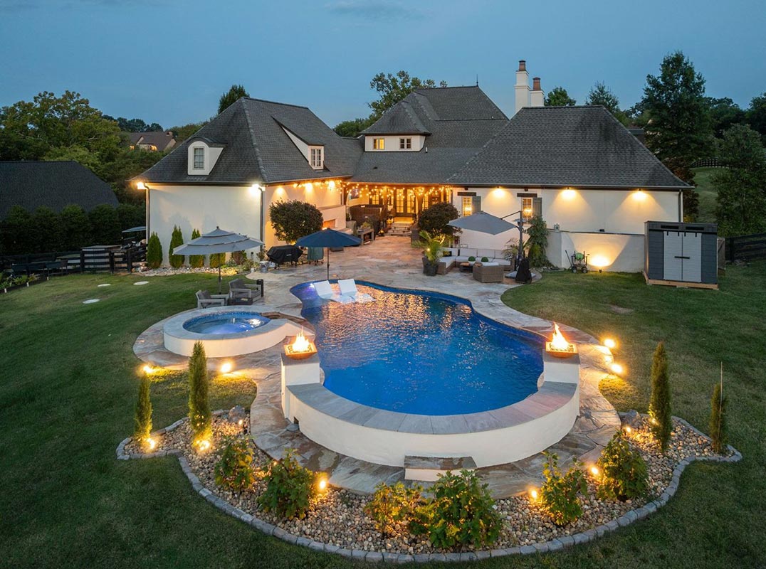 Experience refined country living on 3.39 acres with a private creek, gated entry, and incredible outdoor amenities that create a true resort-style retreat. Extensively renovated, this property pairs timeless architecture with thoughtful modern updates. Inside, the home welcomes you with a dramatic foyer showcasing checkered tile and wainscoting. The main level offers elegant spaces for gatherings, including formal living and dining rooms with gleaming hardwood floors. Arched openings, custom trim, and statement lighting carry throughout, while the coffered-ceiling family room features built-ins and a stone fireplace, flowing seamlessly into a chef’s kitchen. The kitchen is designed for serious cooks and entertainers alike. An oversized island, wet bar, dual sinks, and a full suite of luxury appliances anchor the space—Fisher & Paykel refrigerator/freezer columns, an ILVE Italian dual-fuel range with gold accents, stainless vent hood, dual dishwashers, walk-in pantry, and a fluted glass buffet add both function and style. The primary suite on the main floor provides a private haven, complete with two walk-in closets, a marble shower, soaking tub, and dual vanities. A future bar area can be customized to your taste. Upstairs, one wing hosts a state-of-the-art media room with 11.2 surround sound and flexible storage, while the other offers three bedrooms, two baths, and a versatile bonus area. The grounds are exceptional, offering spaces for both quiet enjoyment and grand entertaining. A covered porch and fireplace patio overlook a sprawling fenced yard with raised garden beds. The pool complex features a sun shelf, integrated spa, and dramatic fire features. A separate creekside firepit provides an intimate escape. Additional highlights include a three-car garage, extended parking, and mature trees lining the private drive. Just minutes from Arrington Vineyards and Franklin, and within easy reach of Nashville.