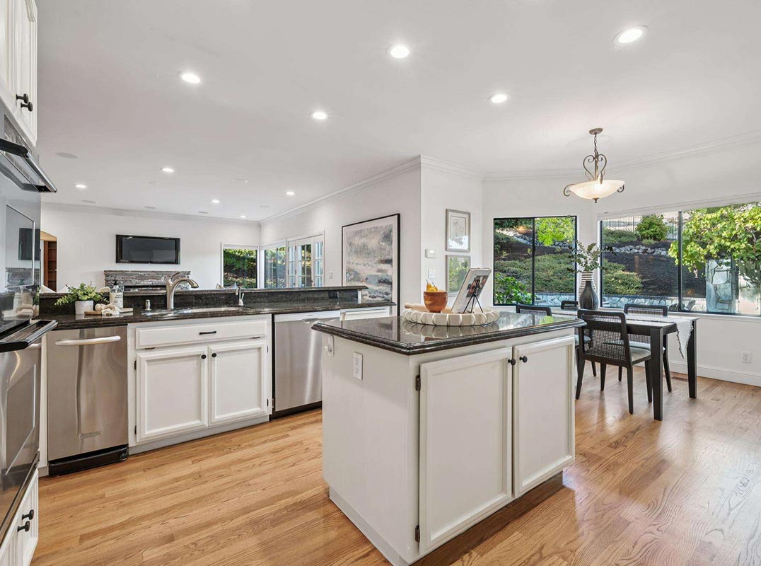 At the heart of the home is a gourmet kitchen designed to inspire. Outfitted with a large walk-in pantry, new cabinet hardware and premium appliances including a built-in Sub-Zero fridge/freezer, Dacor 5-burner gas cooktop, and double ovens, it’s a space that balances performance with beauty. A central island offers ample prep space, while the cozy breakfast nook provides a cheerful spot for casual meals or morning coffee.