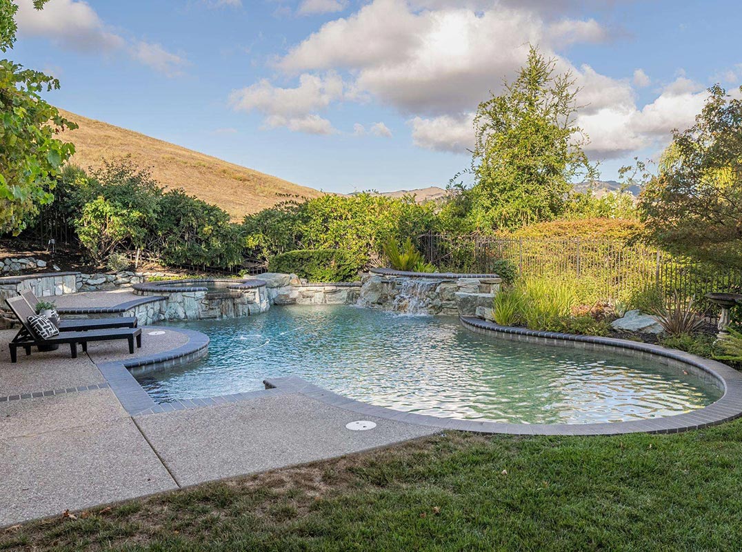 Outdoors, the backyard is a thoughtfully designed haven for leisure and entertaining. A built-in BBQ and gas fire pit set the stage for alfresco dining and evening gatherings beneath the gorgeous trellis, while the shimmering, updated pebble tech style pool with cascading waterfall and beach entry, adds a touch of resort-style indulgence. A manicured lawn provides a safe and open space for children or pets to play, and the property’s location—backing to open space—ensures privacy and scenic beauty. A winding path leads up your own private hillside, perfect for morning walks or sunset reflections.