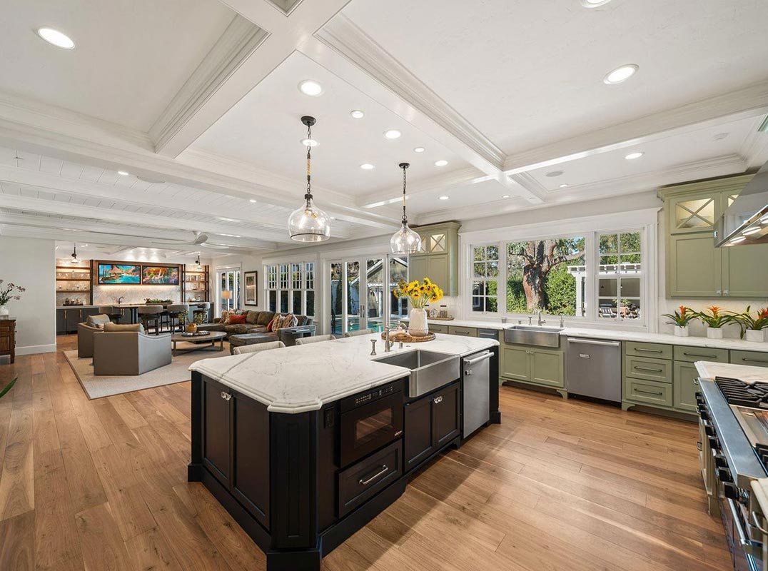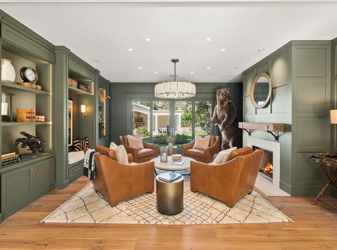 The journey begins in a distinguished sitting room that blends traditional lodge elements with modern luxury. The chef’s kitchen features marble surfaces and premium appliances, connecting seamlessly to the family room and an extensive custom bar that serves as a polished social hub, all overlooking the outdoor entertaining area. A pool and spa are complemented by a pool house with a sauna, a pavilion with a full kitchen and fireplace, a fire pit, a tranquil potting shed, and sweeping golf course views.