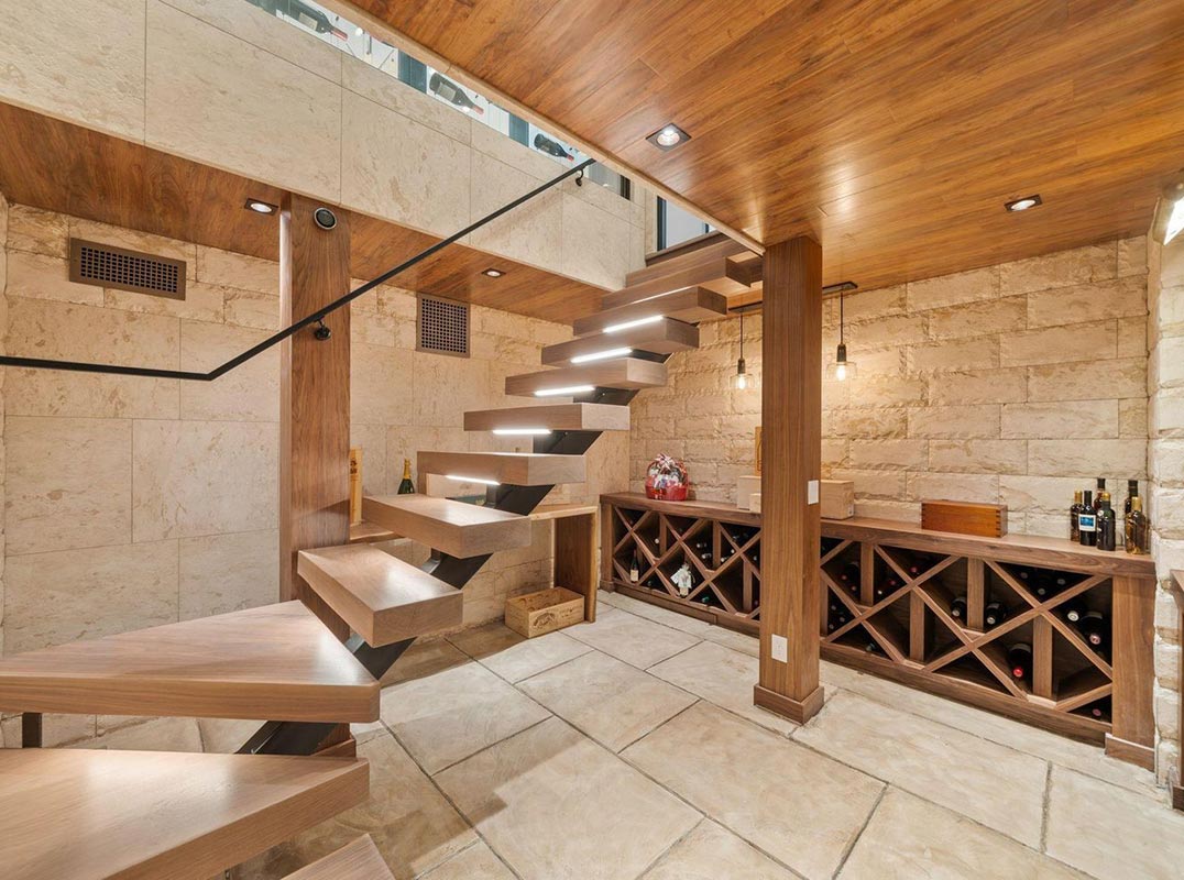 A spacious custom wine cellar is a refined addition to the home, utilizing a mix of organic textures and architectural lighting to create a modern subterranean retreat. Additional spaces include a media room, playroom, bonus room, and private office. The primary suite includes patio access, an expansive walk-in closet, and a spa-like bathroom wrapped in marble and quartz finishes. An upstairs au pair suite with a separate entrance, kitchenette, and full bath provides exceptional flexibility.