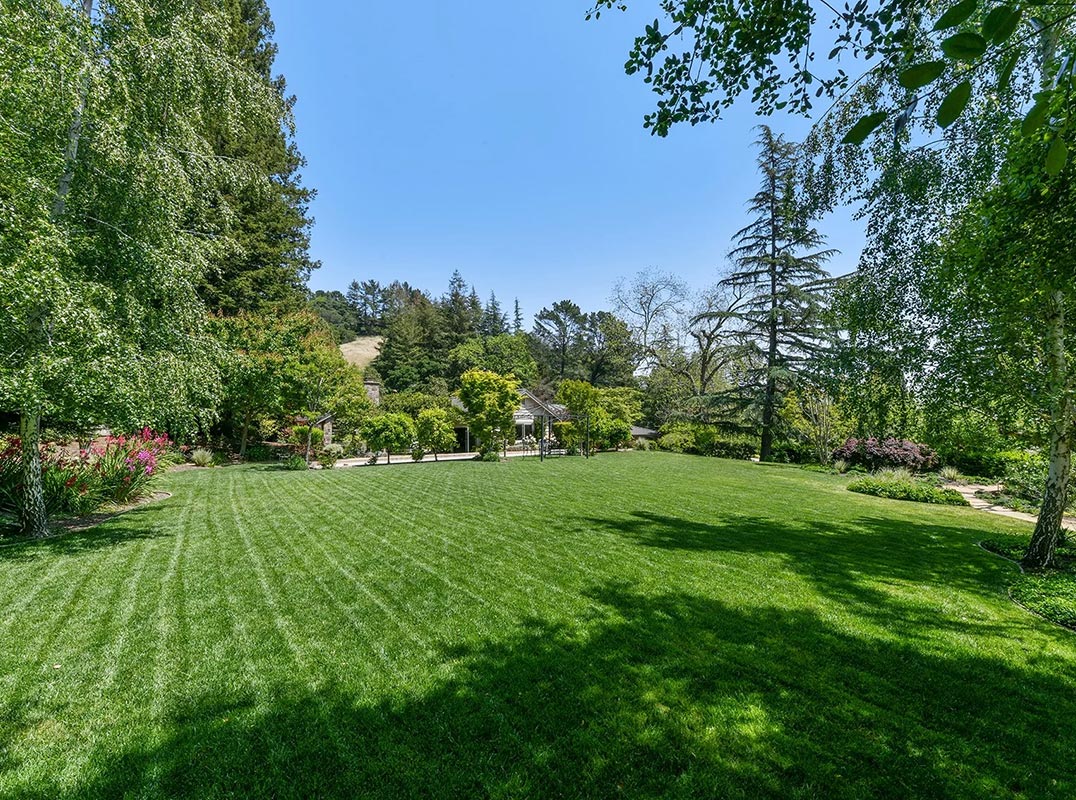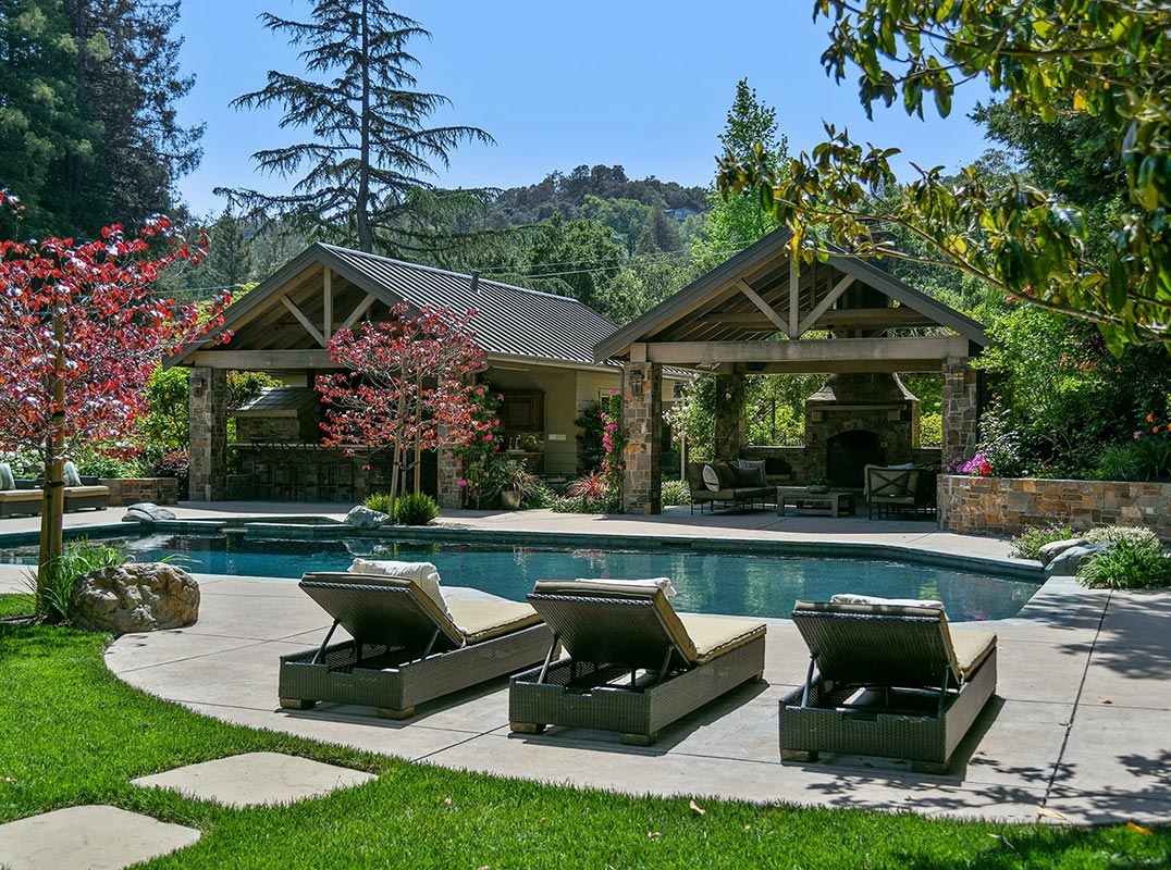 The pool/guest house, with kitchen and full bath, opens to a vine-covered pergola, overlooking the bocce ball court, expansive lawn, and a series of meandering pathways through the property’s manicured gardens designed by landscape architect, David Thorne.