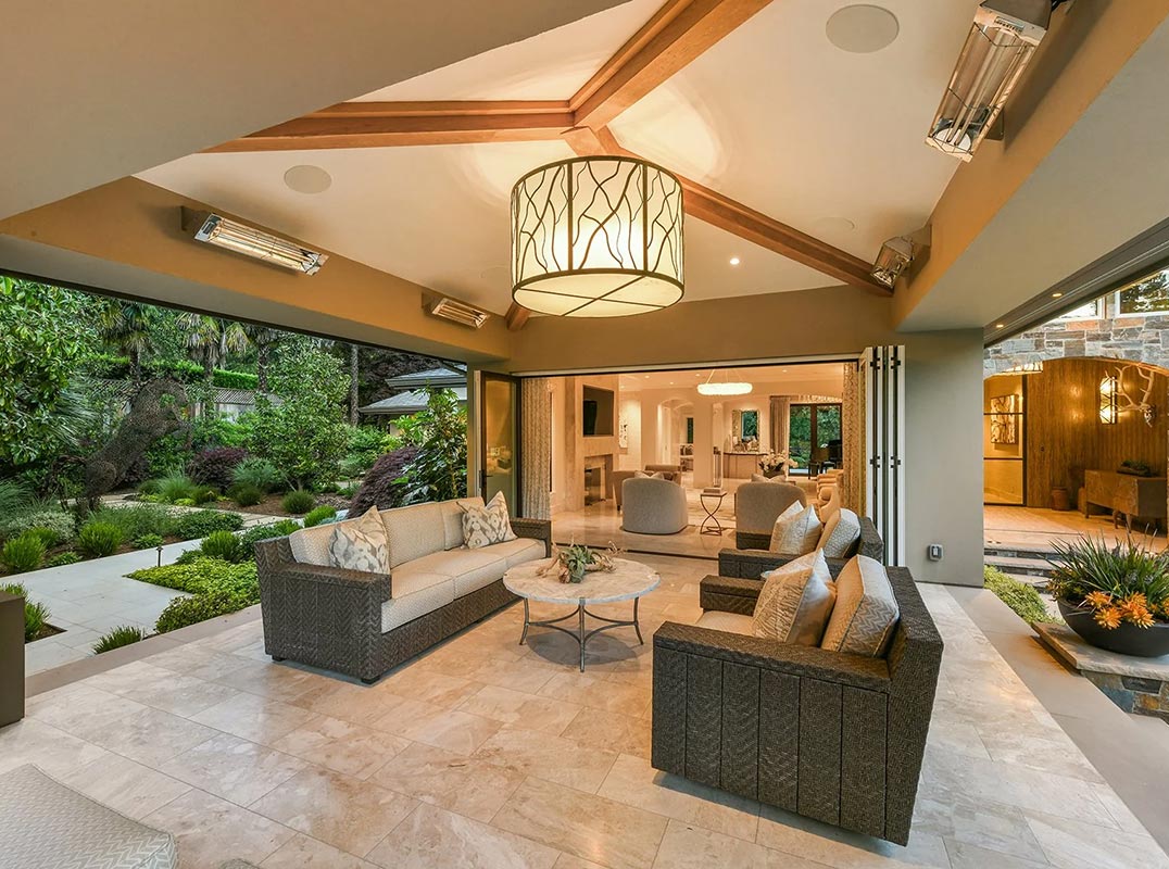Designed by architect Alan Page and re-built in 2017 by local luxury builder, McKenzie Gray, the refined, transitional design is reflected in every detail from the unique textured wallpapers to the beautiful custom cabinetry and high-end finishes. The living room has a wall of folding glass doors that open completely to a covered loggia with overhead heating and a large fire pit allowing for year-round indoor/outdoor enjoyment. Step out onto one of the patios to experience a morning coffee, lounge poolside, or just enjoy nature while dining al fresco beside a soothing water feature.