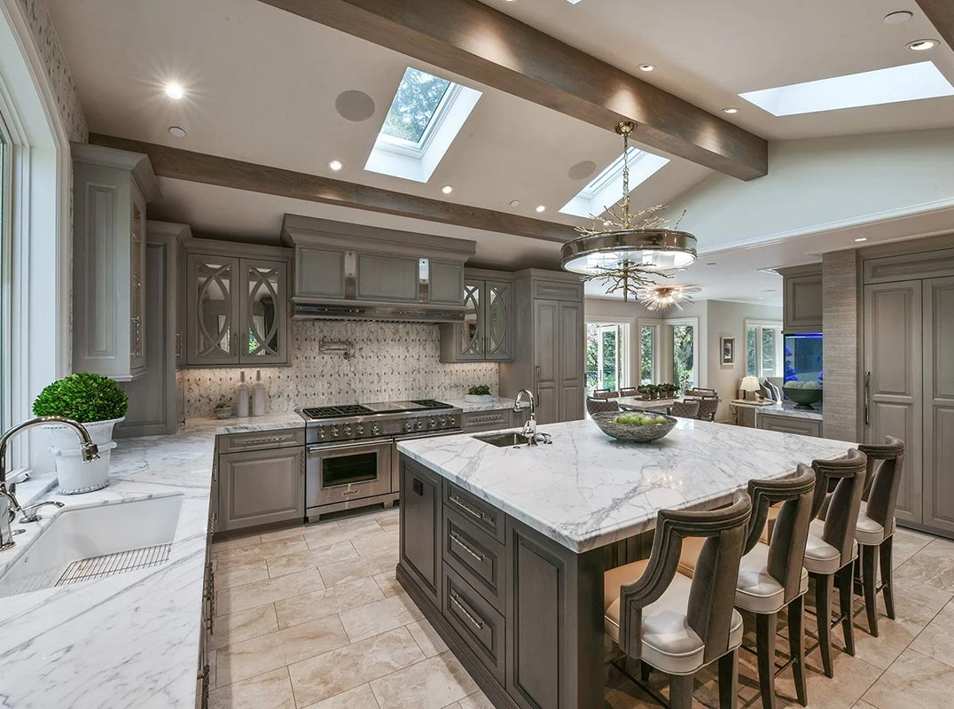 Large windows and skylights beautifully light the impeccably designed kitchen, with doors that open to a cutting garden, vegetable gardens, and fruit trees. The breakfast room offers casual dining and a beautiful built-in aquarium.