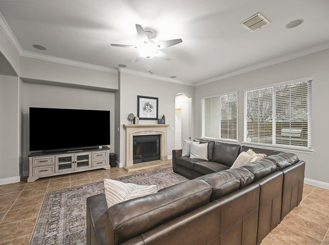 Light-filled Monterosso estate on a private court and spacious corner lot o ering 4,241 sqft with 6 bedrooms, loft, and 4.5 bathrooms. Highly desirable main-level bedroom and full bath provide an ideal setup for multi-generational living, guests, or a private o ce. The thoughtfully designed floor plan features a formal dining room with French doors opening to a covered courtyard with fireplace and mounted TV—creating an inviting indoor-outdoor living space. A butler’s pantry o ers additional storage and prep space while connecting to the granite kitchen with large center island, abundant cabinetry, and stainless steel appliances. The spacious primary suite includes a private retreat, built-in desk with custom cabinetry, dual vanities, soaking tub, walk-in shower, and two oversized closets. Upstairs o ers Jack-and-Jill bedrooms, a versatile loft ideal for media or play, two additional bedrooms with adjacent bath, and convenient laundry room.