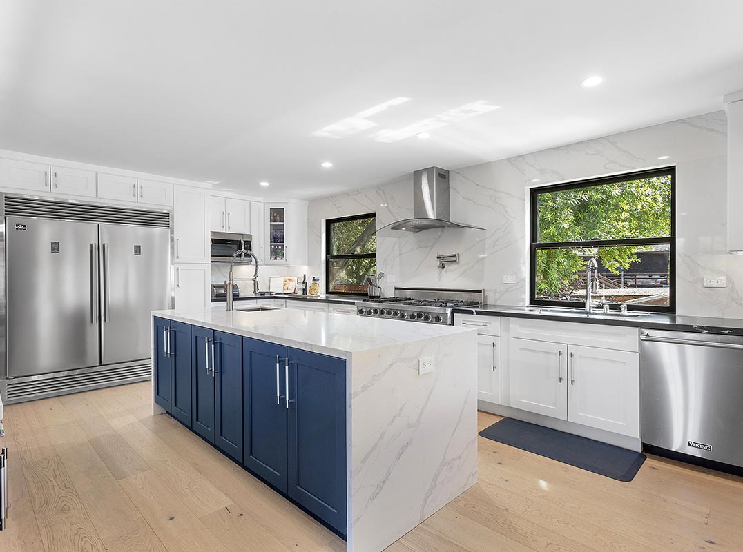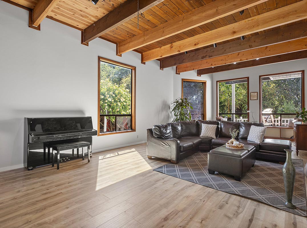 The primary suite is spacious & tranquil on the 2nd floor, nestled among the trees offering fantastic vistas. Three additional bedrooms & bath sit across the roof deck from the primary suite. A second kitchen, living area, bedroom, bathroom, & private deck sit at the rear of the house.